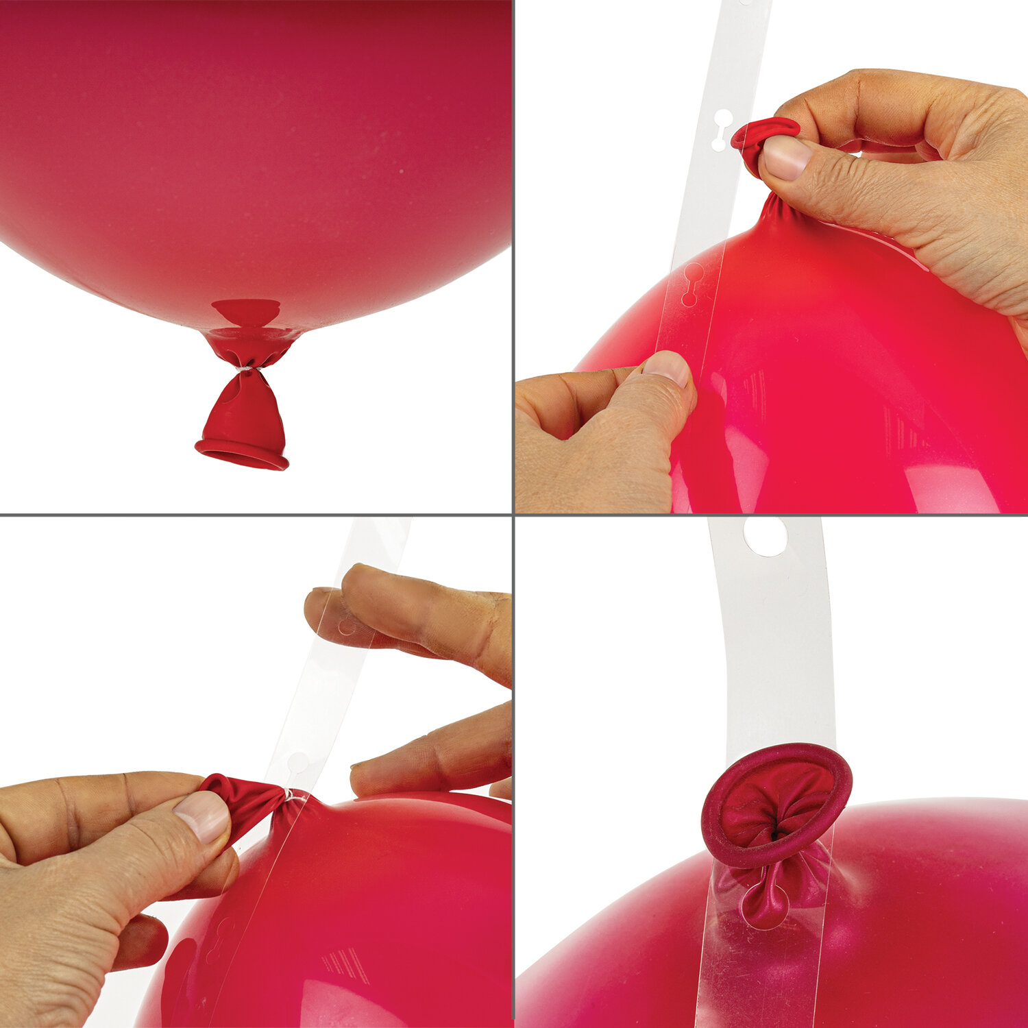Полипропиленовая соединительная лента для крепления воздушных шаров различных размеров предназначена для моделирования гирлянд, арок, различных фигур из шаров. Чтобы использовать ленту для изготовления гирлянды из шаров, необходимо просто продеть в широкое отверстие завязанный «хвостик» надутого шарика, а затем сдвинуть его в отверстие меньшего диаметра, таким образом зафиксировав воздушный шарик. Лента, как держатель, помогает оформить шары в композицию.