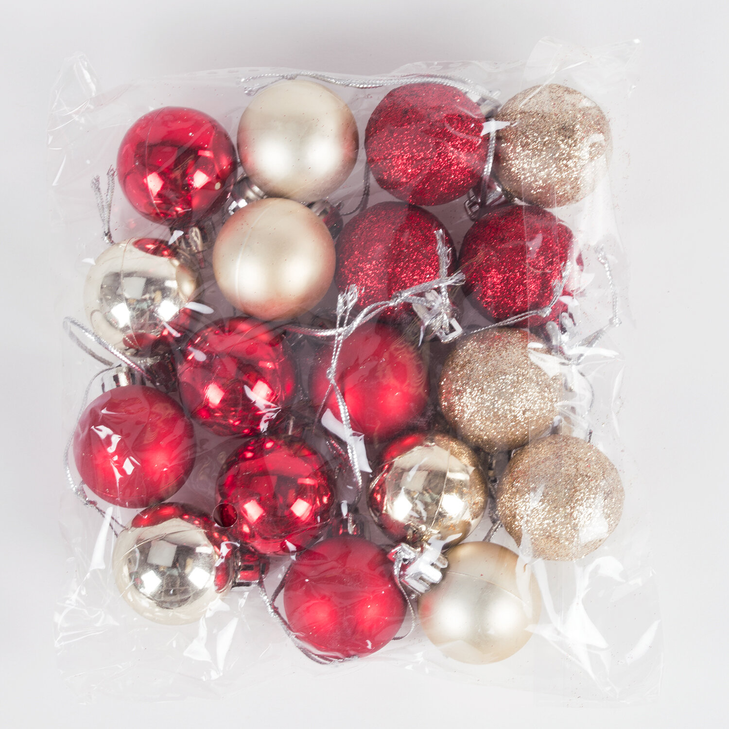 – набор подвесных пластиковых украшений для ели (18 пластиковых шаров). Пластиковые шары дополнительно упакованы в прозрачный полиэтиленовый пакет;