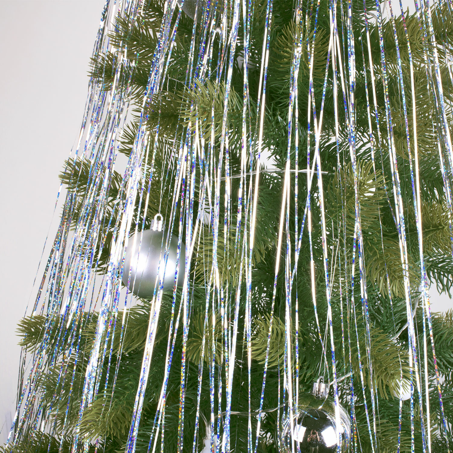 Высота дождика в расправленном и подвешенном виде составляет 1,5 м, ширина – 10 см. Материал дождика – полиэтилентерефталат. Эффект голографии завораживает взгляд и создает атмосферу зимней сказки.