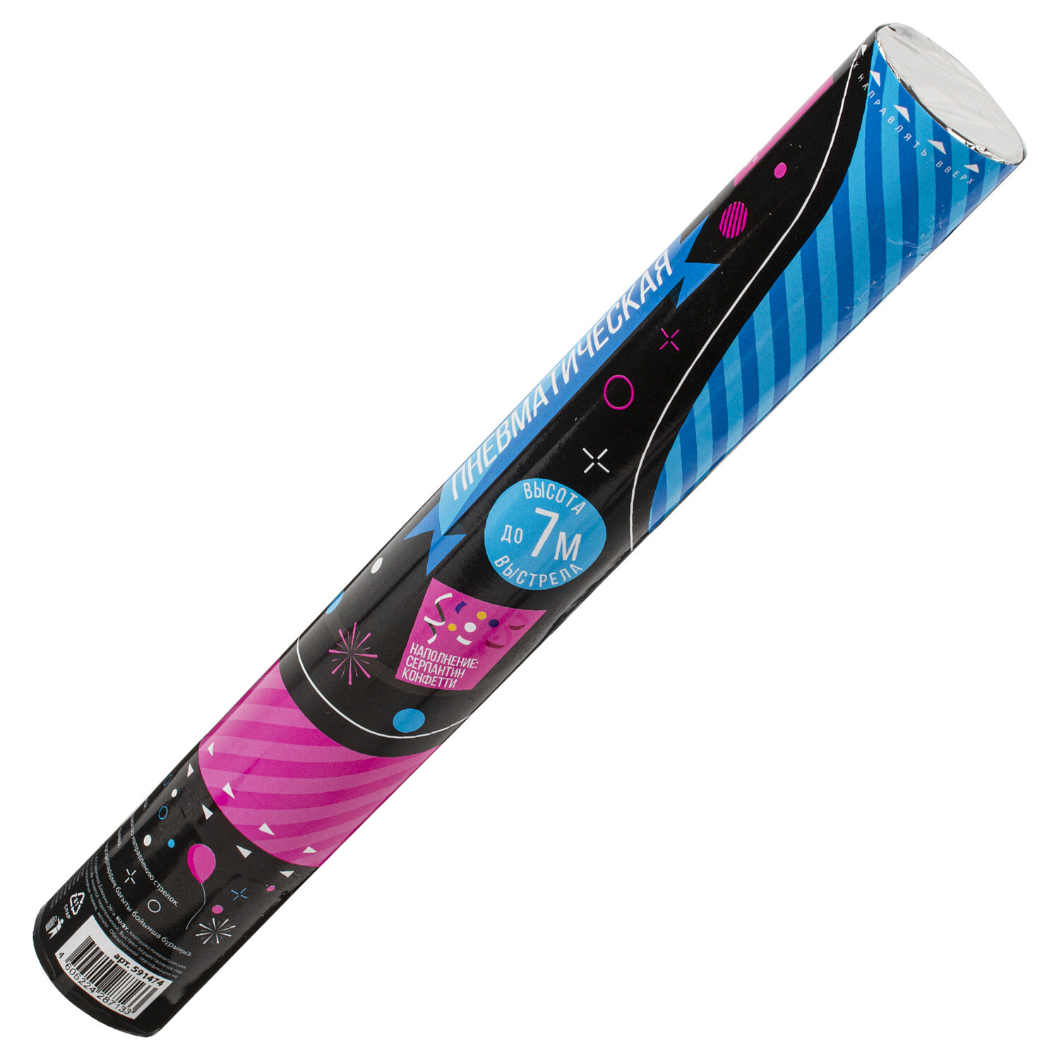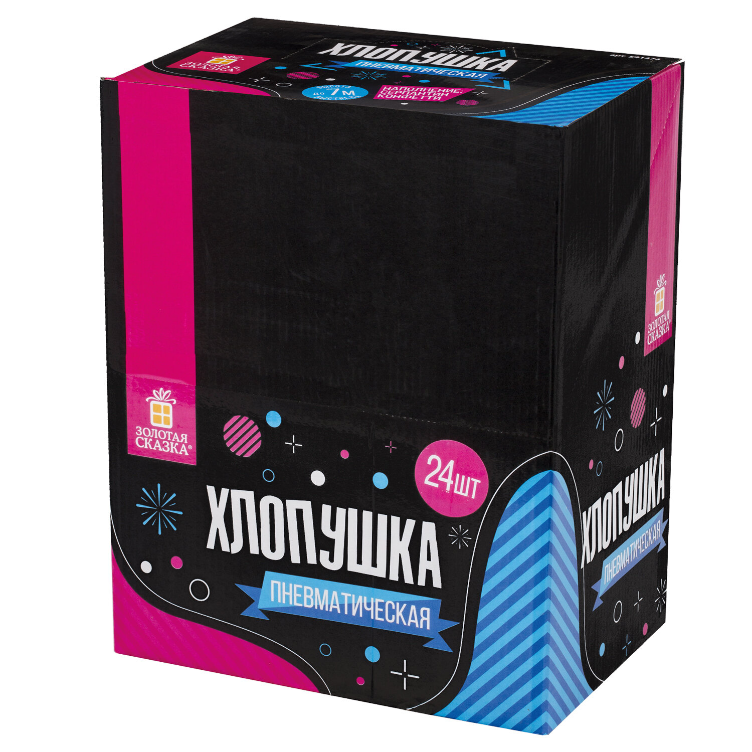 Выстрел осуществляется под действием сжатого воздуха. Не является пиротехникой. Средняя дальность выстрела – 5-7 м. Корпус хлопушки состоит из двух частей: пневматического баллона со сжатым воздухом и картонного цилиндра с наполнителем. Рекомендуется использовать хлопушку внутри больших помещений или на улице. Хлопушка пневматическая ЗОЛОТАЯ СКАЗКА 30 см, фольга, серпантин, ассорти, 591474