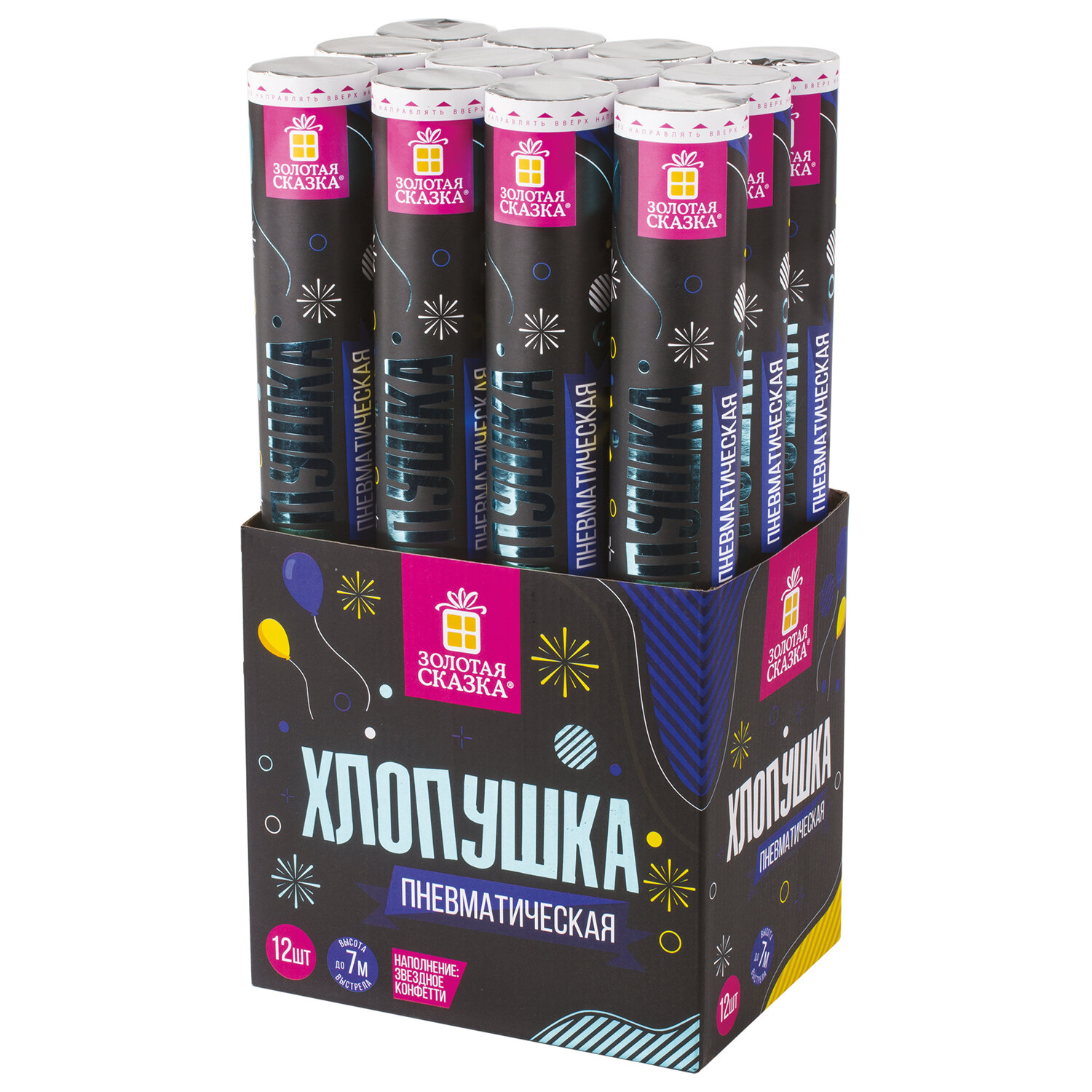 Хлопушка высотой 40 см с фольгированным наполнителем в виде звезд цвета ассорти является абсолютно безопасной. Выстрел осуществляется под действием сжатого воздуха. Не является пиротехникой. Средняя дальность выстрела – 5-7 м. Корпус хлопушки состоит из двух частей: пневматического баллона со сжатым воздухом и картонного цилиндра с наполнителем. Рекомендуется использовать хлопушку внутри больших помещений или на улице. Хлопушка пневматическая ЗОЛОТАЯ СКАЗКА 40 см, фольга, звезды, ассорти, 591480