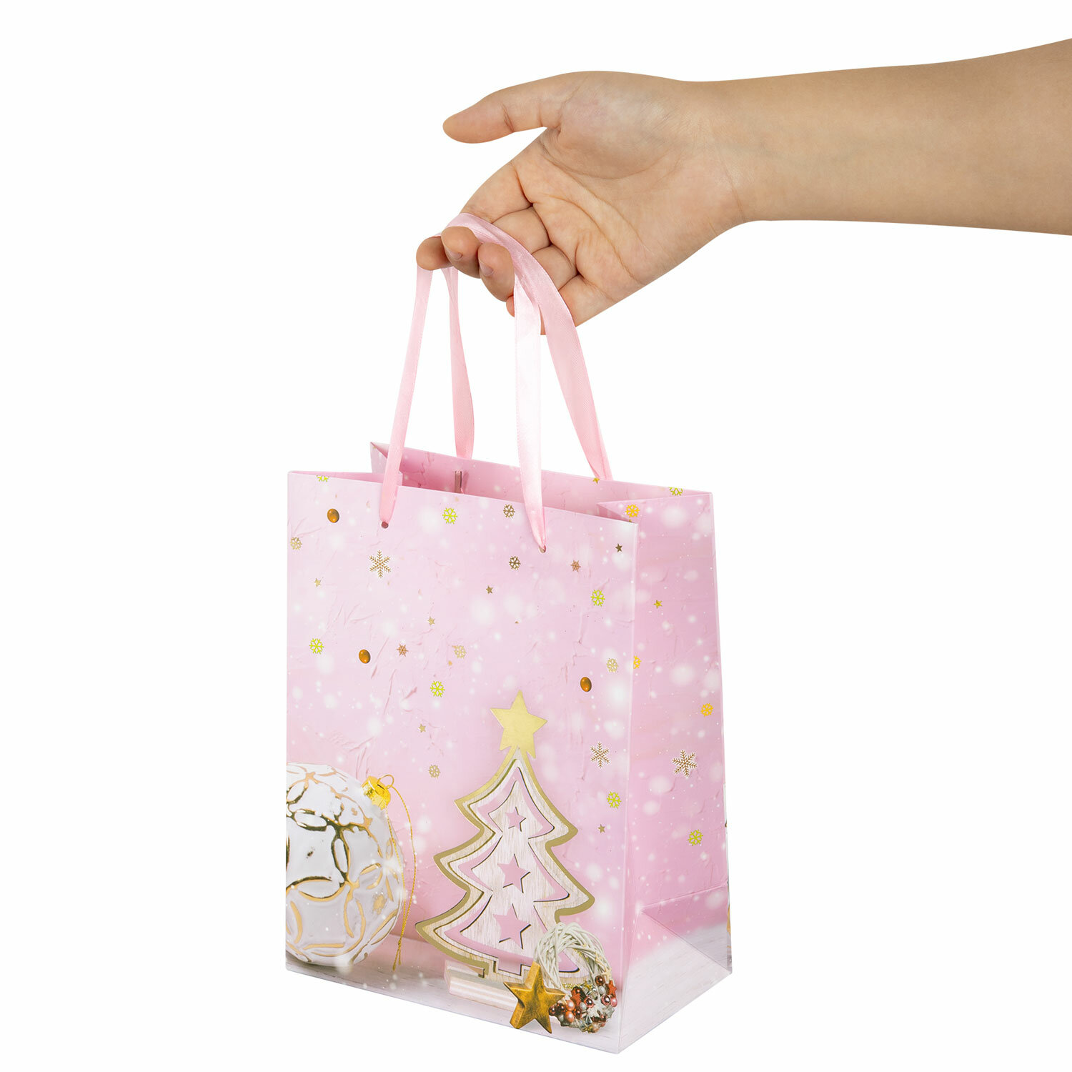 Изготовлен из ламинированного мелованного картона с ленточными ручками из полиэстера. Размер – 18x10x23 см. Пакет выполнен в розовом и золотистом цветах с изображением праздничных новогодних атрибутов. С лицевой стороны пакета некоторые детали покрыты тиснением золотистой фольгой. Пакет подарочный (1 штука) новогодний 18x10x23 см, ЗОЛОТАЯ СКАЗКА "Lilac Story", фольга, 608233