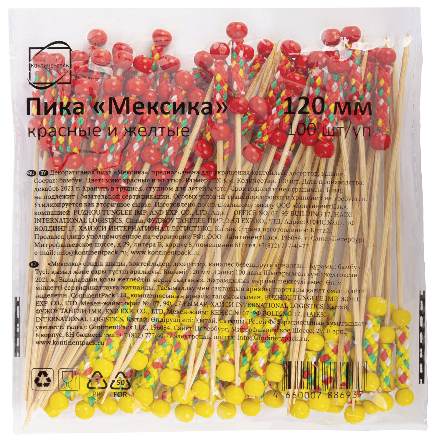 Длина пики для канапе составляет 12 см, что позволяет создавать канапе и мини-бутерброды различных размеров. В упаковке вы найдете 100 штук, что обеспечит вас достаточным количеством пик для создания разнообразных закусок. Пики для канапе бамбуковые "Мексика", 12 см, 100 шт., КП, 138289