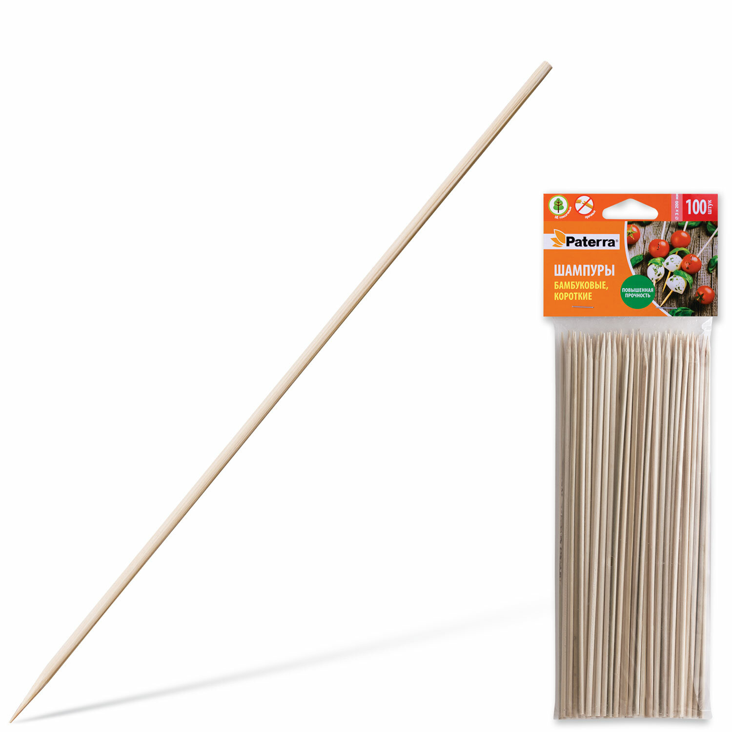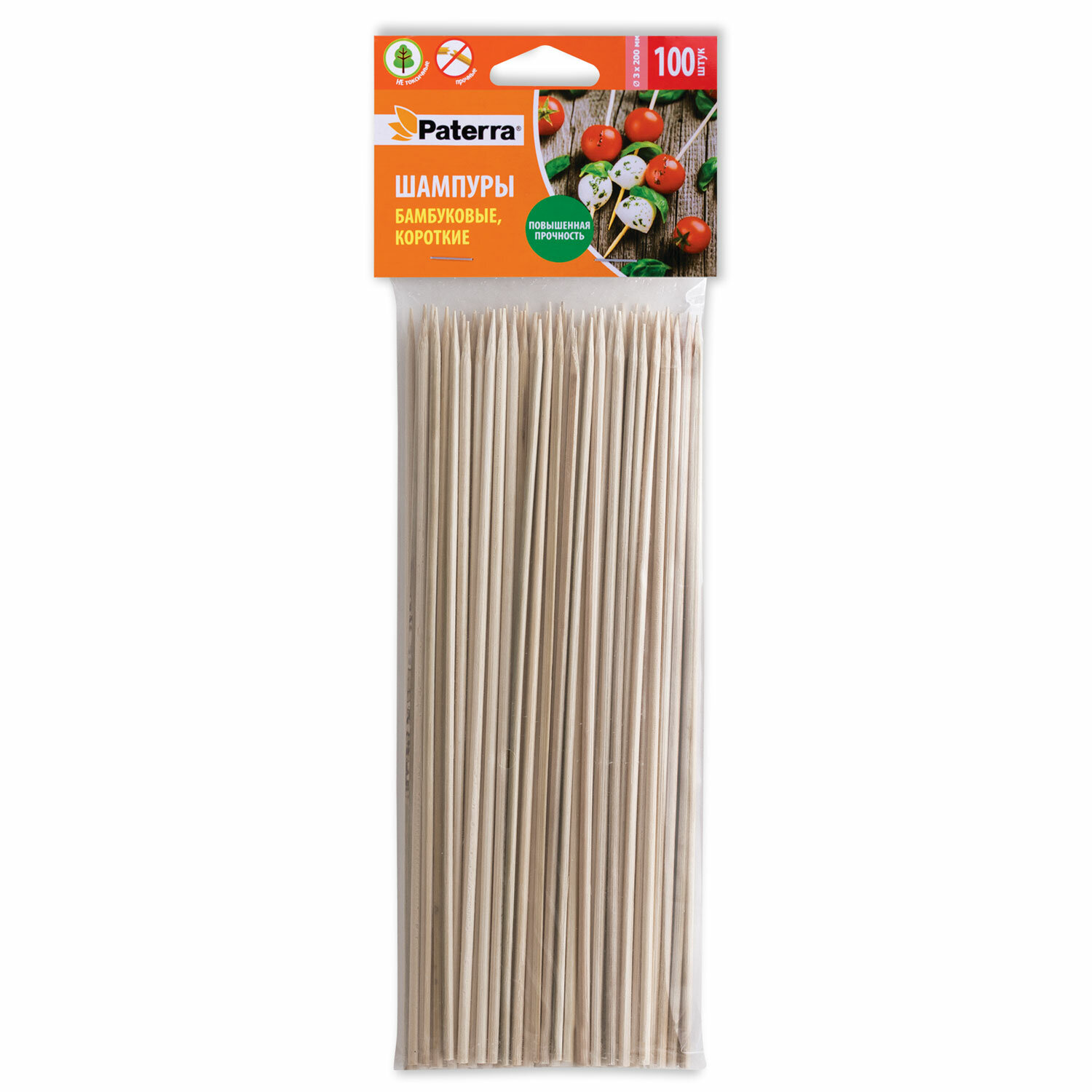 - Шампуры для шашлыка PATERRA, КОМПЛЕКТ 100 шт., 200 мм, d=3 мм, бамбуковые, 401-697, 401697