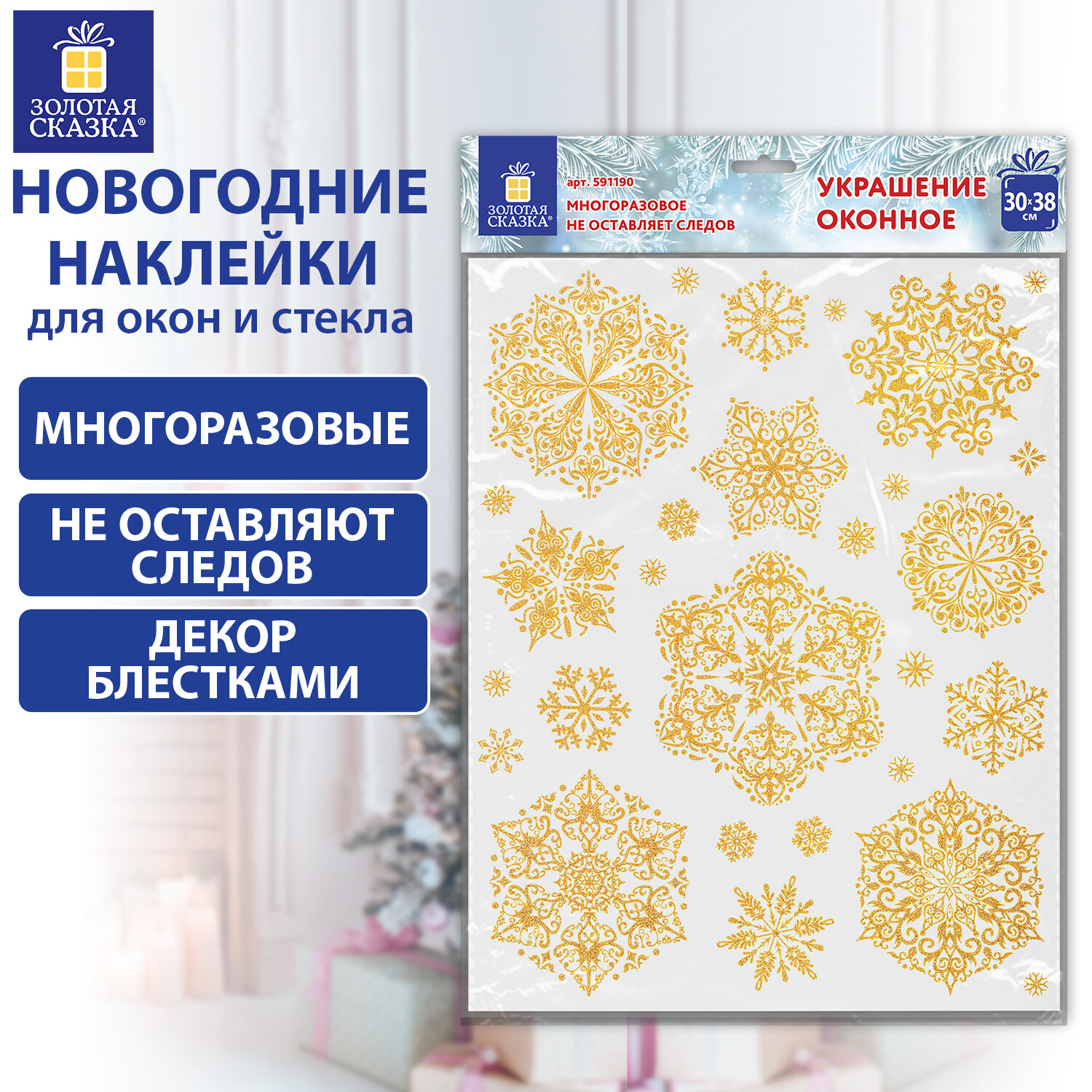 - Наклейка для окон двусторонняя МНОГОРАЗОВАЯ 30х38 см "Снежинки" глиттер, золото ЗОЛОТАЯ СКАЗКА, 591190