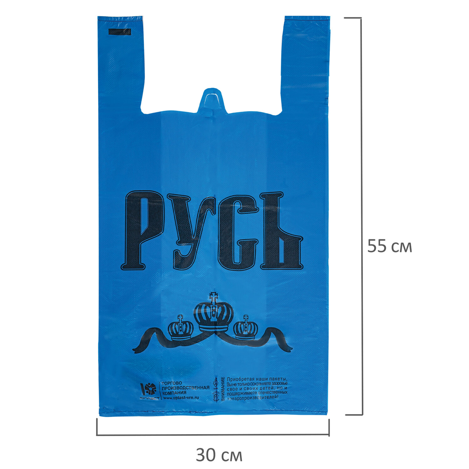 Пакеты типа "майка" - незаменимые для упаковки, переноски продуктов и промышленных товаров. Широко применяются в домашнем хозяйстве, в торговых сетях магазинов и на производственных предприятиях. Цена за упаковку. Пакеты "майка", КОМПЛЕКТ 100 шт., 30+16х55 см, ПНД, "Русь", СИНИЕ, 25 мкм, ЮПЛАСТ, ЮМАЙ1072