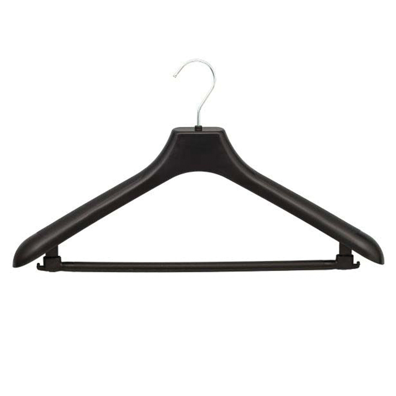 Универсальная пластиковая пустотелая вешалка с широкими плечиками для верхней одежды. Высокая степень прочности и надежности: выдержит не только костюм, но и пальто. Идеальна для применения как в гардеробных общего пользования, так и для дома. Вешалка-плечики, размер 48-50, пластик, анатомическая, перекладина, крючки для бретелей, черный, С024/С044