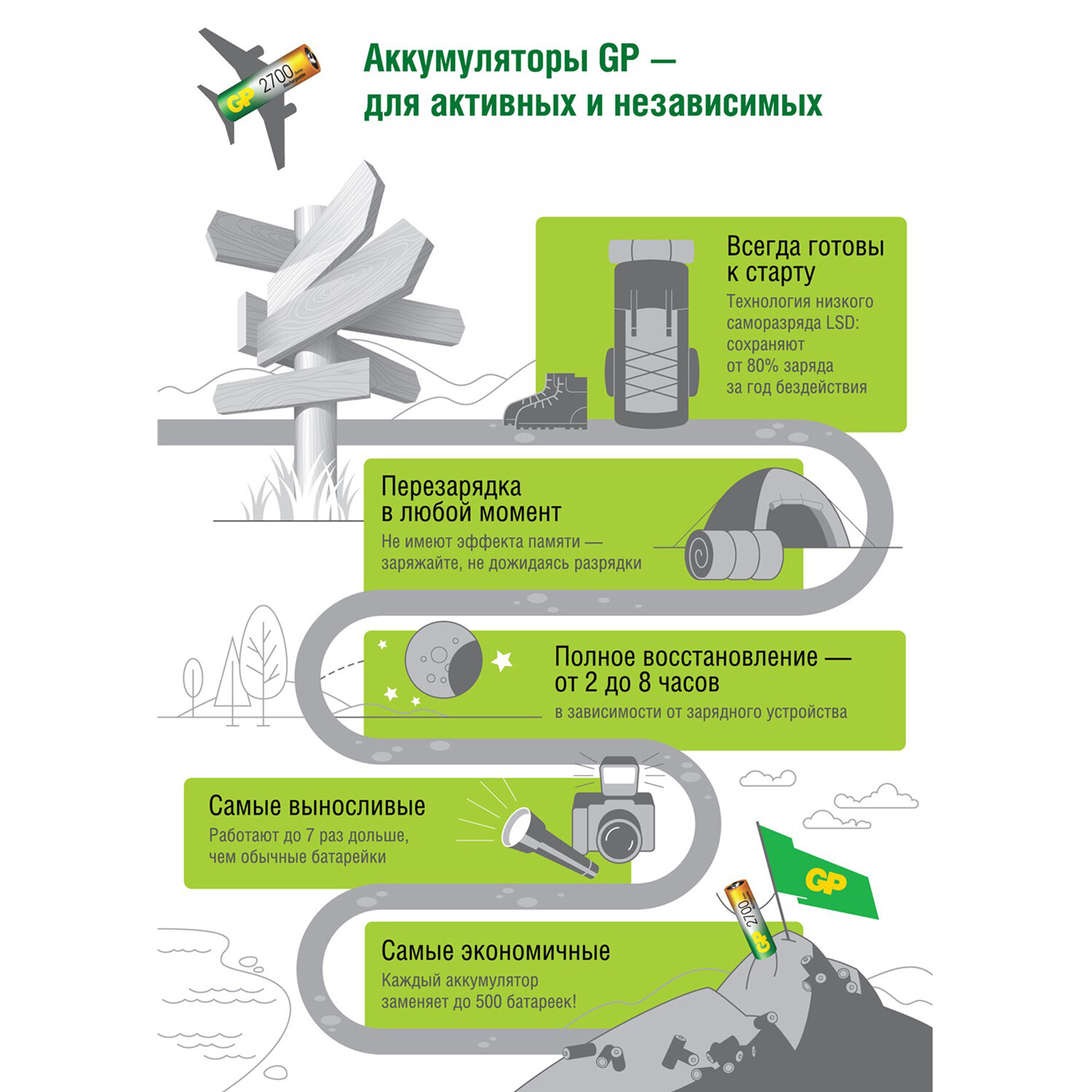 При производстве аккумуляторов нового поколения от GP не используются тяжёлые металлы и вредные примеси. Батареи не текут и при надлежащей утилизации не представляют опасности для вашего здоровья и окружающей среды.