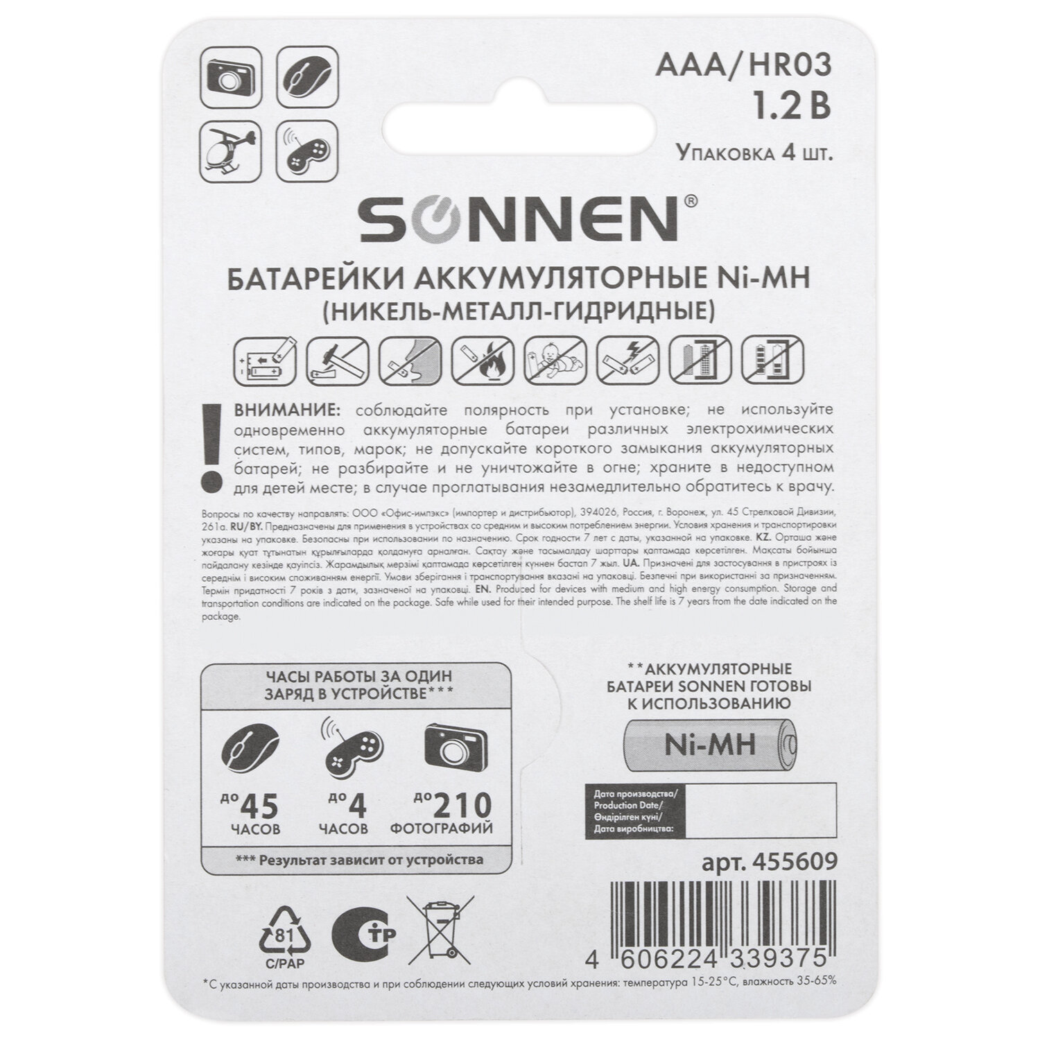 Производитель сохраняет за собой право на внесение изменений в технические характеристики, комплектацию и конструкцию данной модели для улучшения эксплуатационных свойств без предварительного уведомления. Батарейки аккумуляторные Ni-Mh мизинчиковые КОМПЛЕКТ 4 шт., AAA (HR03) 650 mAh, SONNEN, 455609