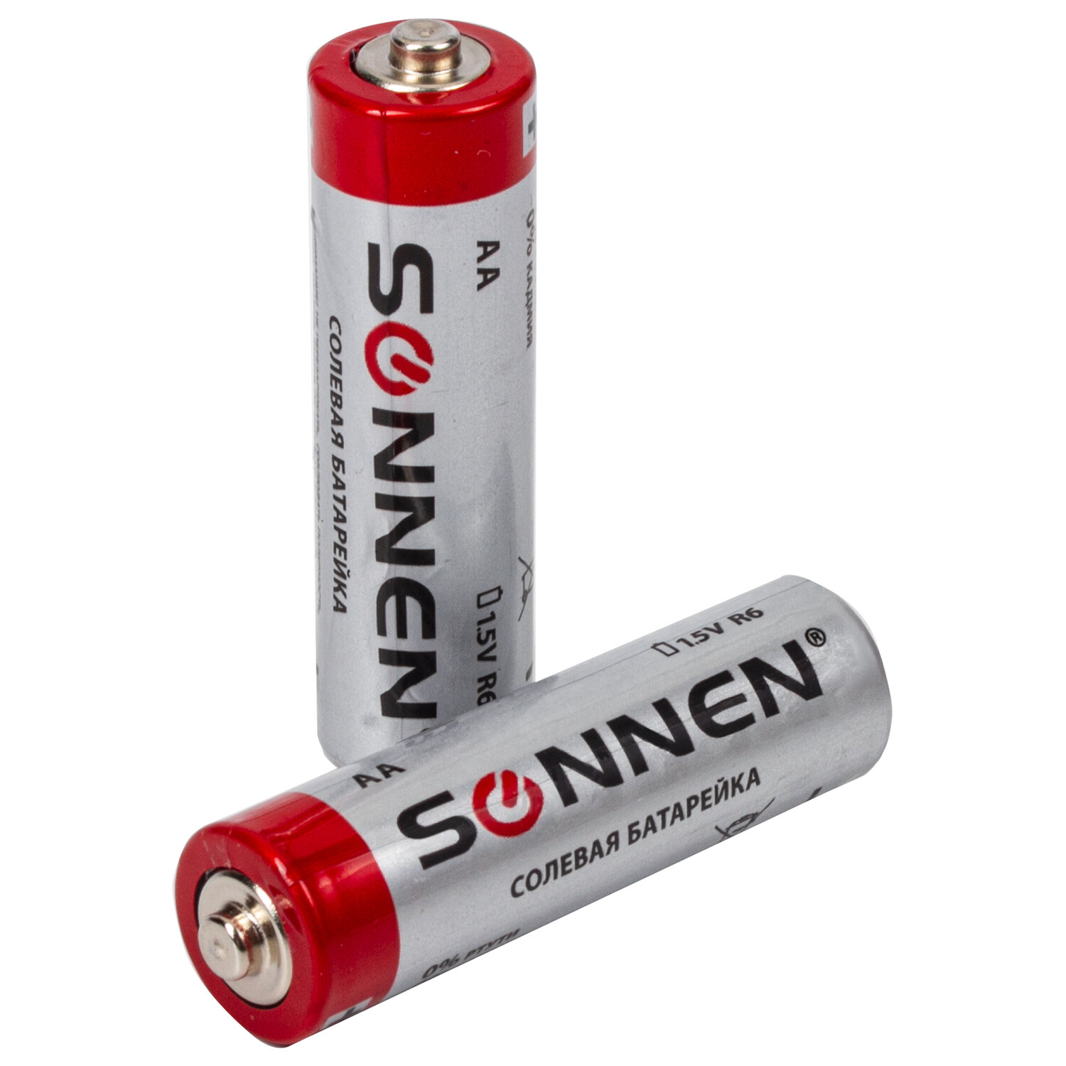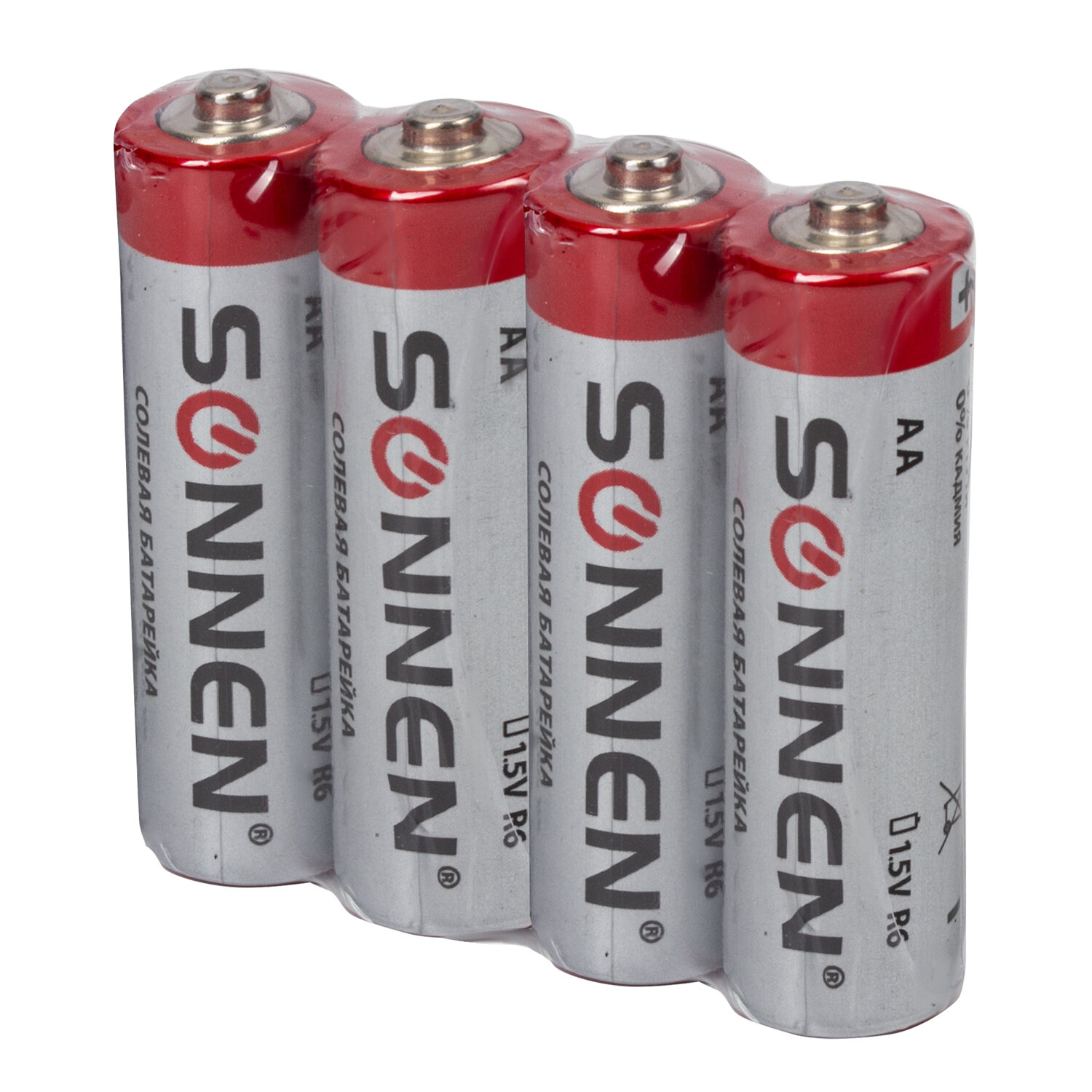 - Батарейки КОМПЛЕКТ 4 шт., SONNEN, АА (R6, 15А), солевые, пальчиковые, в пленке, 451097