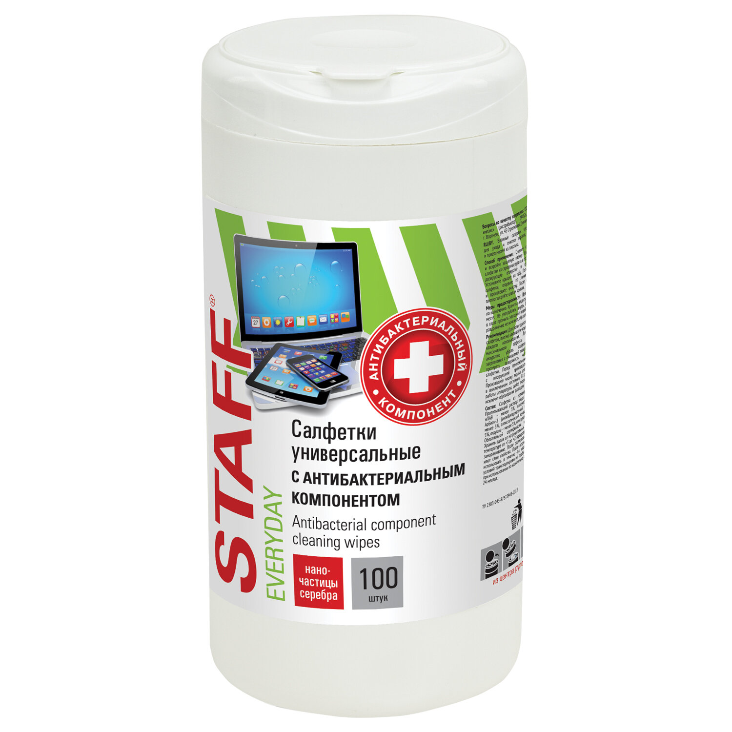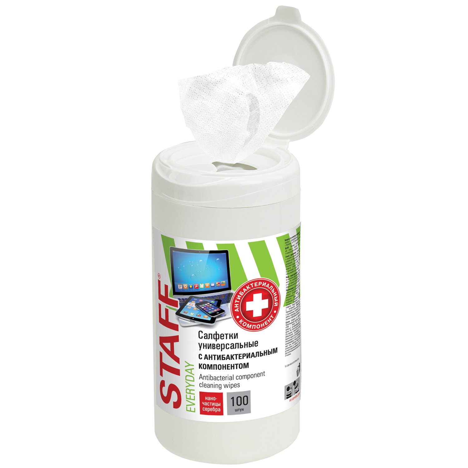 - Салфетки АНТИБАКТЕРИАЛЬНЫЕ универсальные, STAFF "EVERYDAY", 100 шт., 513478