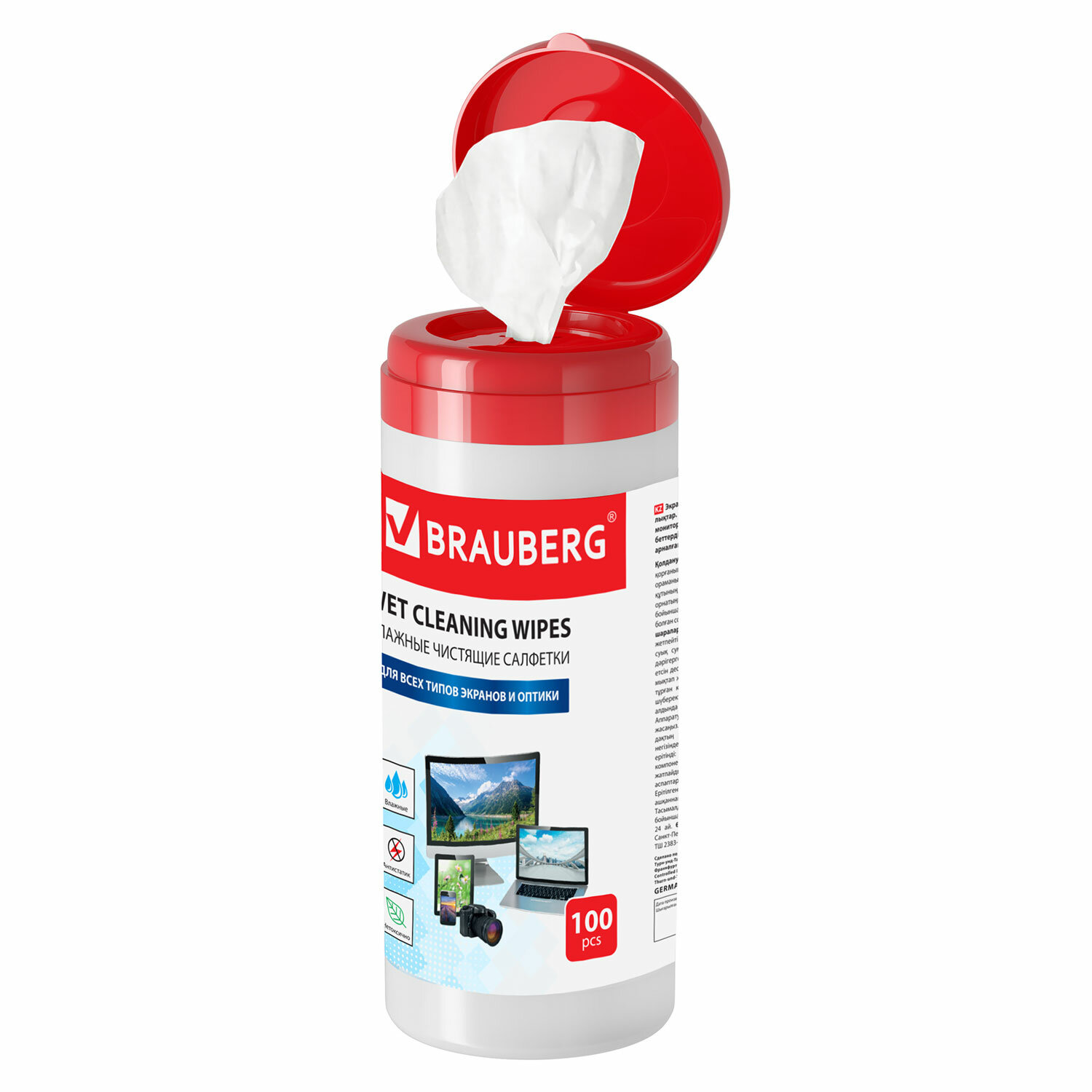 - Салфетки для экранов всех типов и оптики BRAUBERG, туба 100 шт., влажные, 510122
