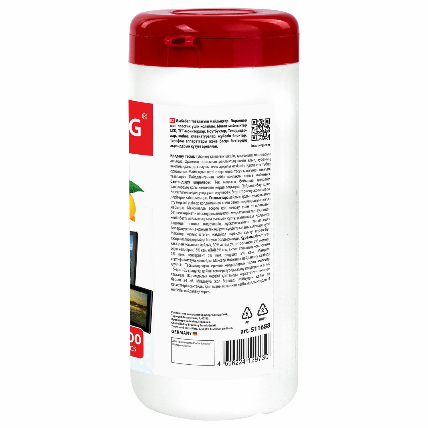 - Салфетки для экранов всех типов и пластика BRAUBERG с ароматом "ЛИМОН", туба 100 шт., влажные, 511688