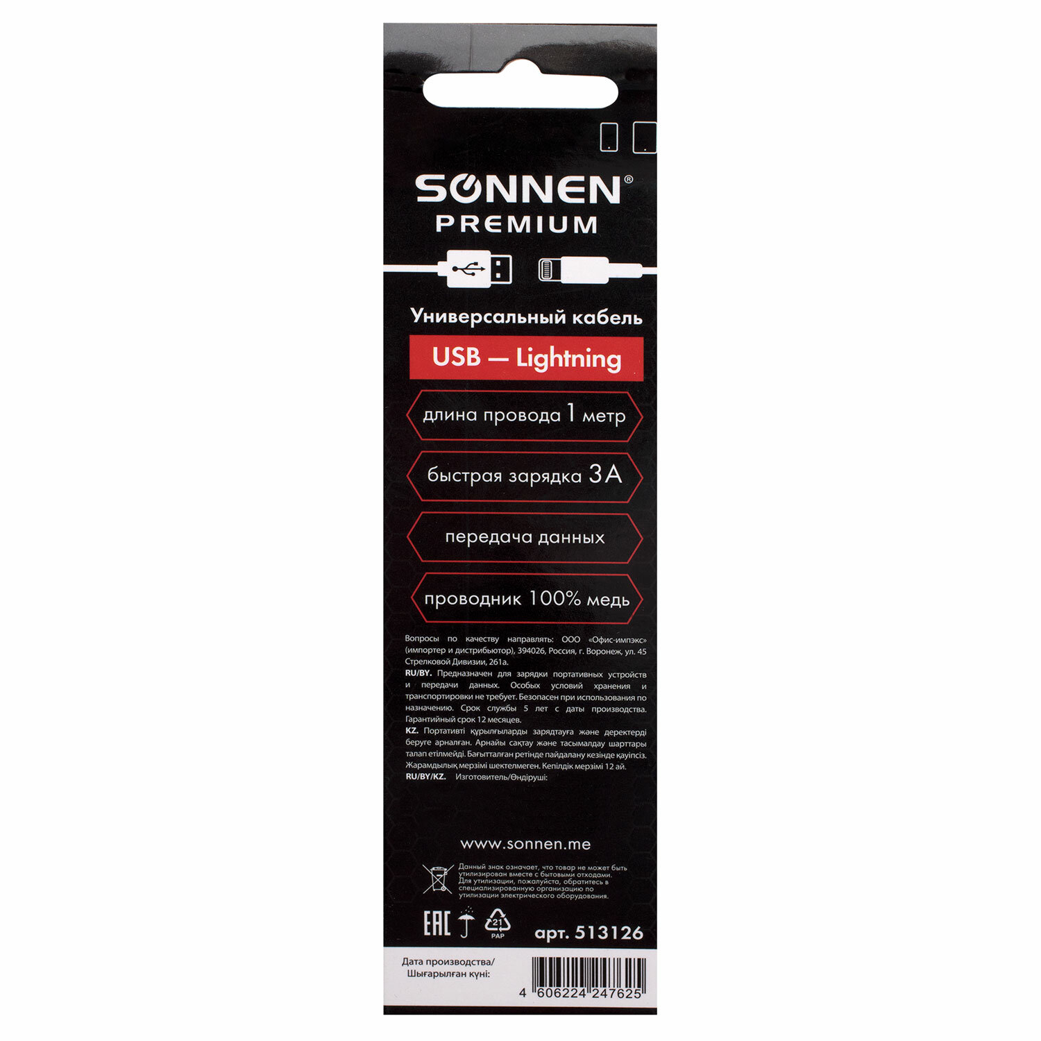 Кабель USB 2.0 – Lightning, 1 м, SONNEN Premium, медь, для передачи данных и зарядки, 513126