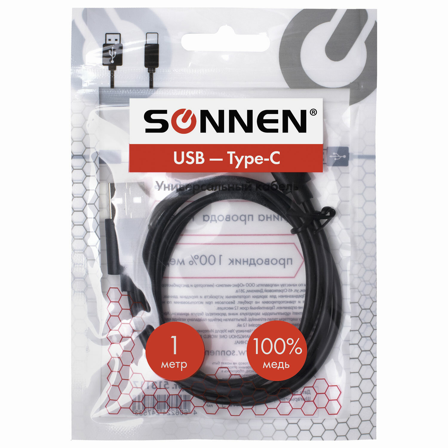 - Кабель USB 2.0 – Type-C, 1 м, SONNEN, медь, для передачи данных и зарядки, черный, 513117