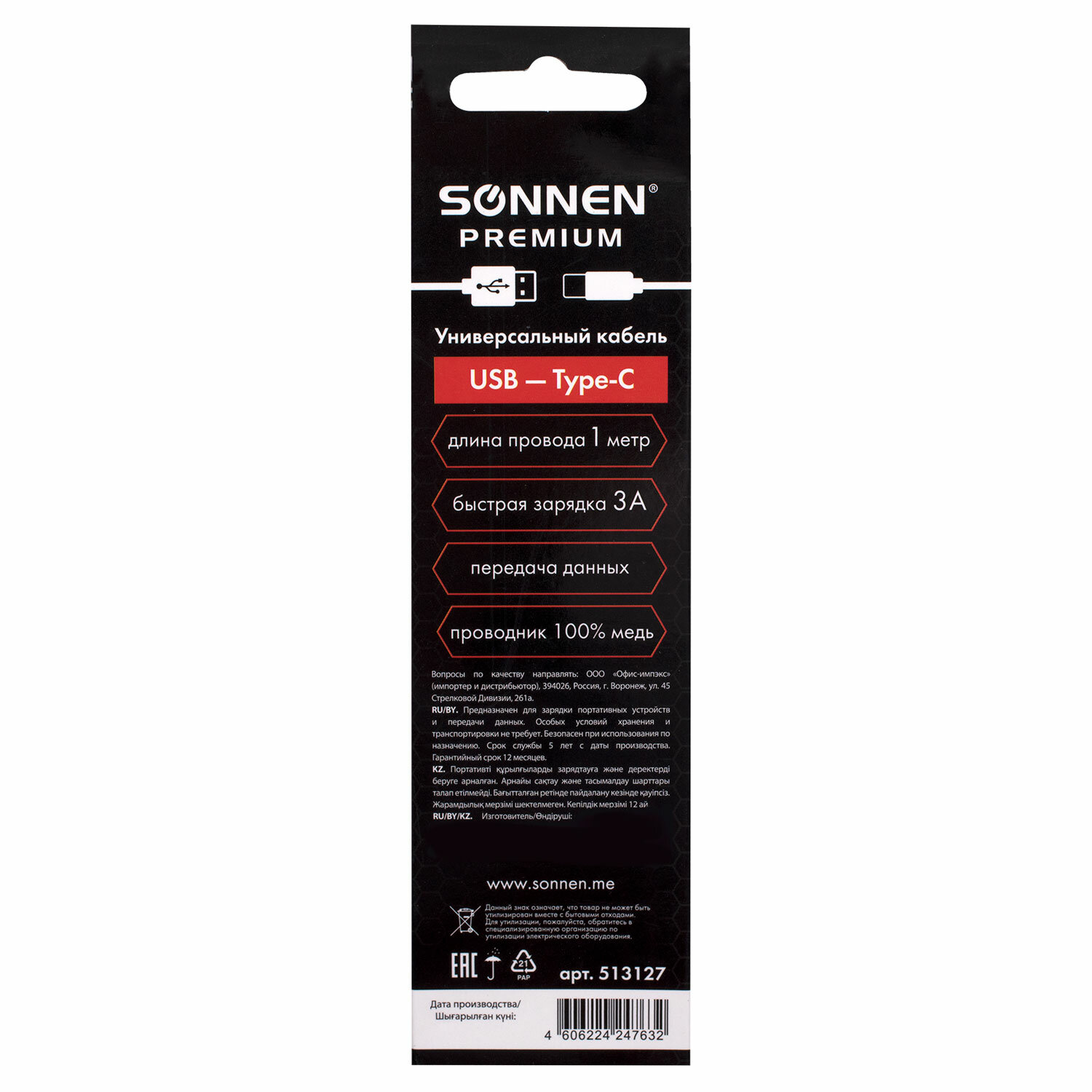 - Кабель USB 2.0 – Type-C, 1 м, SONNEN Premium, медь, передача данных и быстрая зарядка, 513127