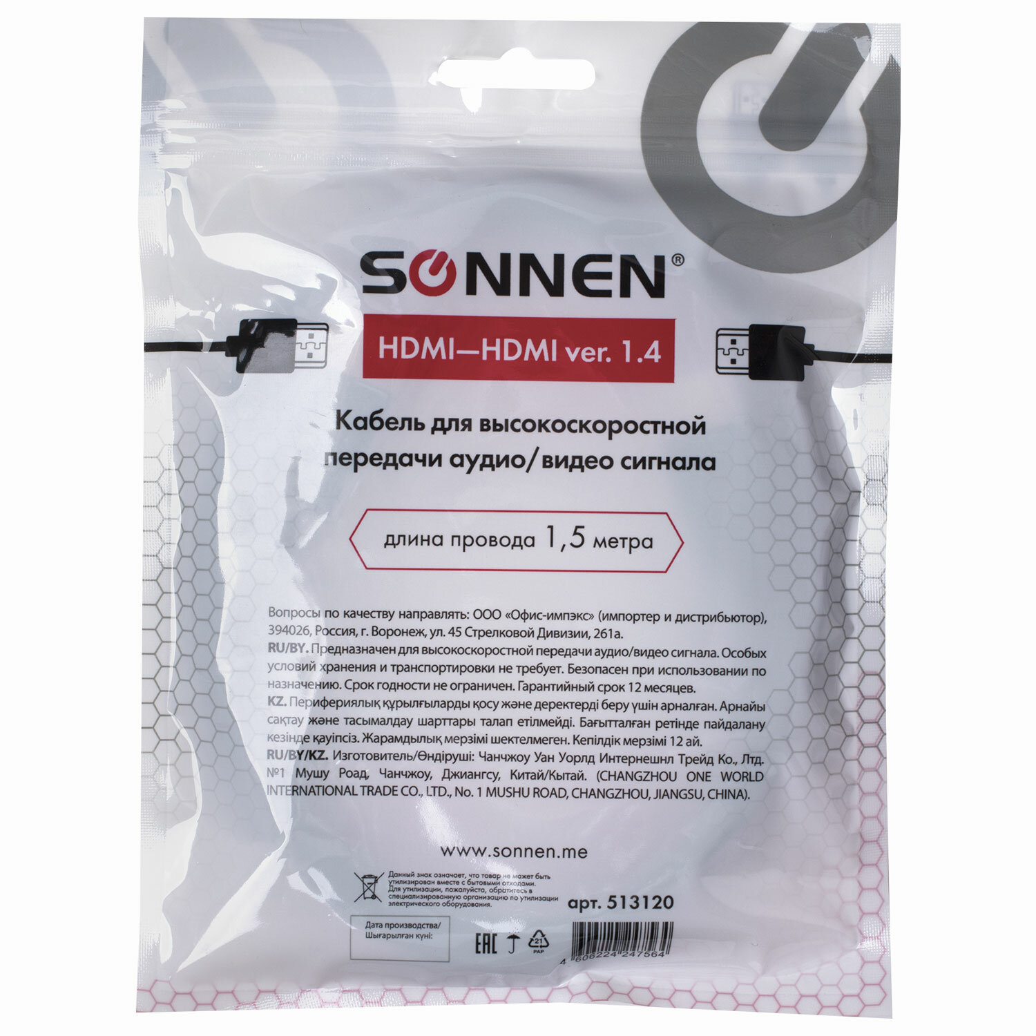 Кабель HDMI AM-AM, 1,5 м, SONNEN, ver 1.4, FullHD, 4К, для ноутбука, компьютера, монитора, телевизора, проектора, черный, 513120