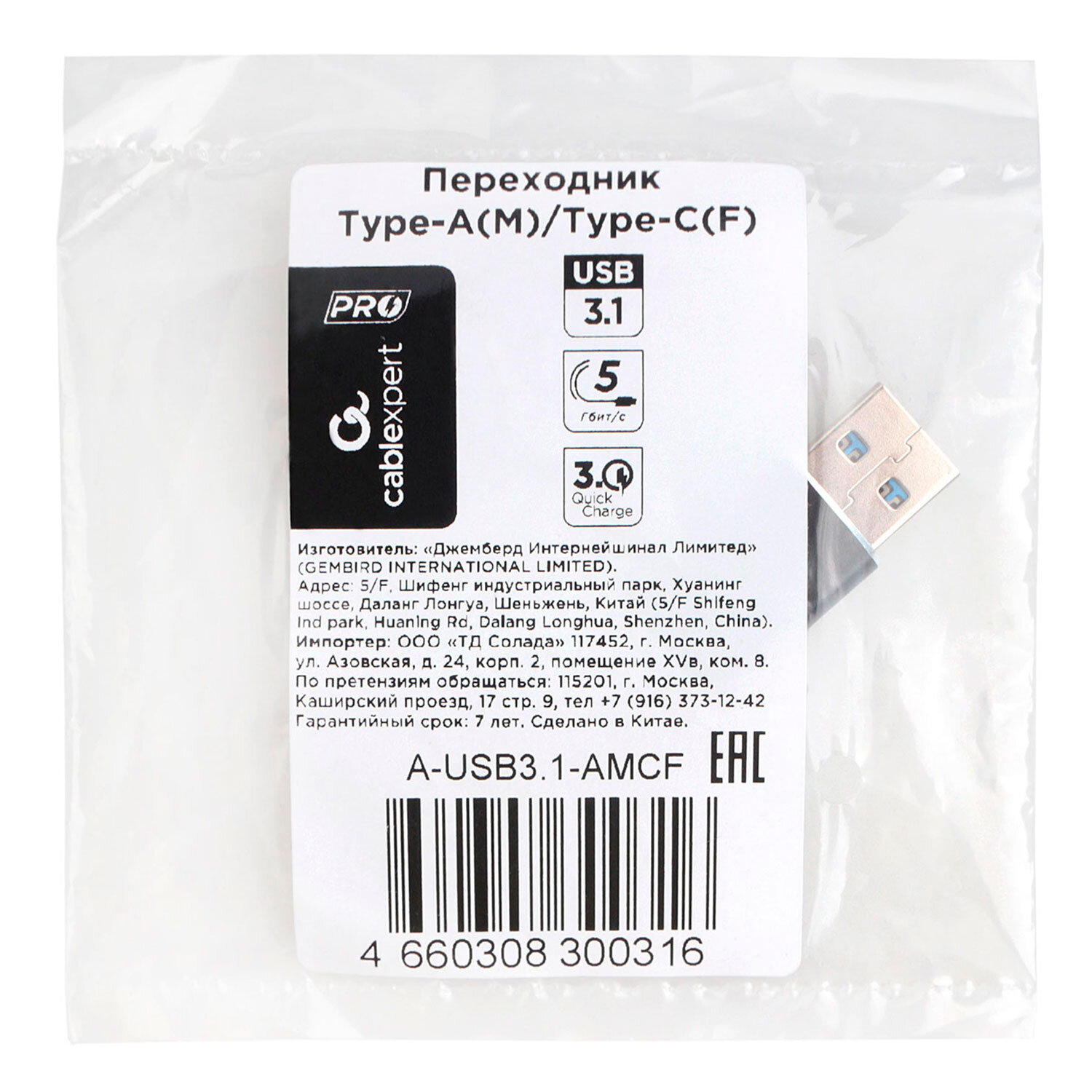 - Переходник USB 3.1 AM/Type-C (F), CABLEXPERT 5 Гбит/с, QC3.0, металлический корпус, Pro, черный, A-USB3.1-AMCF