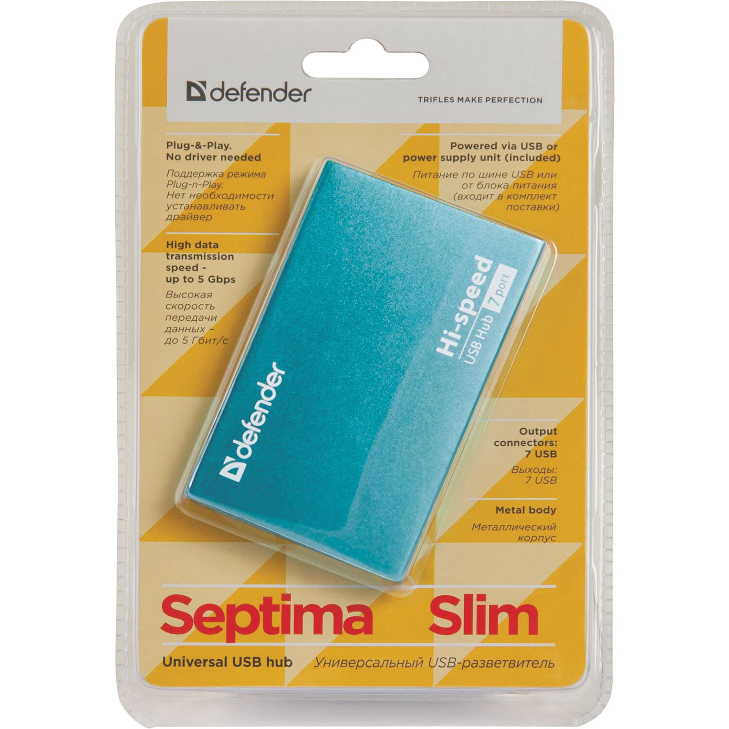 Характеристики, внешний вид и комплектация товара могут быть изменены фирмой-производителем без предварительного уведомления. Хаб USB 2.0, 7 портов, порт для питания, синий, DEFENDER SEPTIMA SLIM, 83505