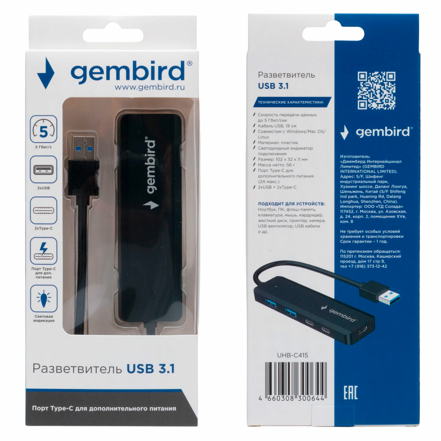 Вся информация на сайте о товарах носит справочный характер и не является публичной офертой в соответствии с пунктом 2 статьи 437 ГК РФ. Производитель оставляет за собой право изменять характеристики товара, его внешний вид и комплектность без предварительного уведомления продавца. Хаб USB 3.1, 2хUSB, 2хType-C, с дополнительным питанием (Type-C), кабель USB 19 см, черный, GEMBIRD UHB-C415