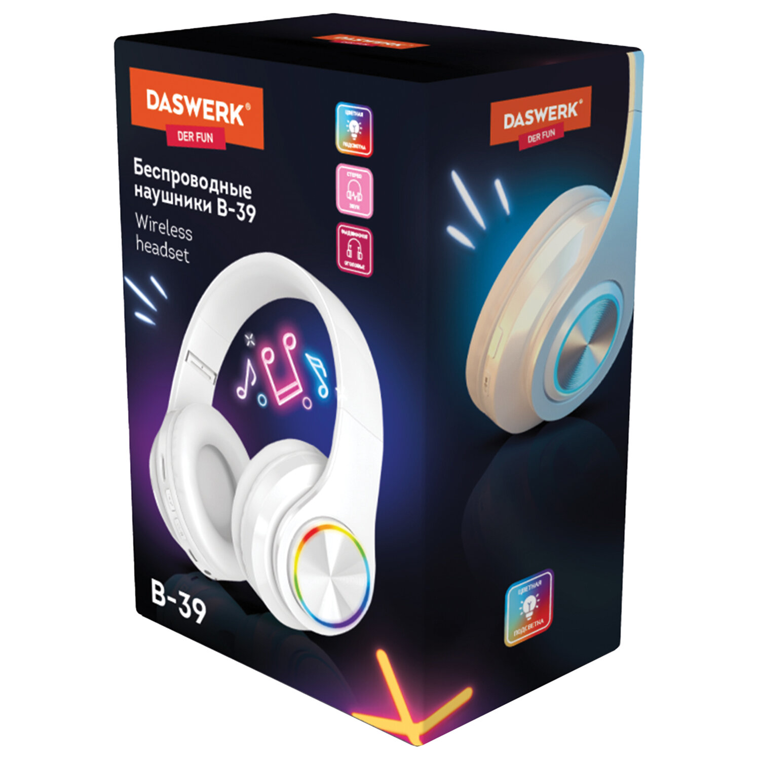 - гарантийный талон. Наушники беспроводные большие светящиеся накладные, белые DASWERK B-39, 513806