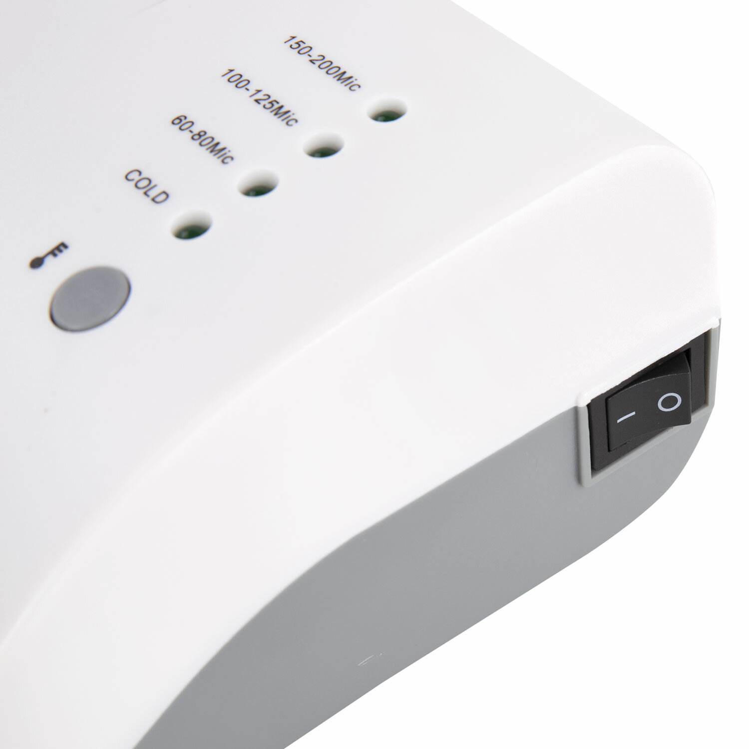 Для включения ламинатора переместите выключатель, который расположен на правой боковой панели, из положения t;Ot; в положение t;It;. На рабочей панели подписан каждый режим для соответствующего диапазона пленок. Легко можно переключать температуру нагрева с помощью кнопки, расположенной под индикаторами. О готовности ламинатора к использованию укажет световой индикатор, который перестанет моргать и загорится зеленым.