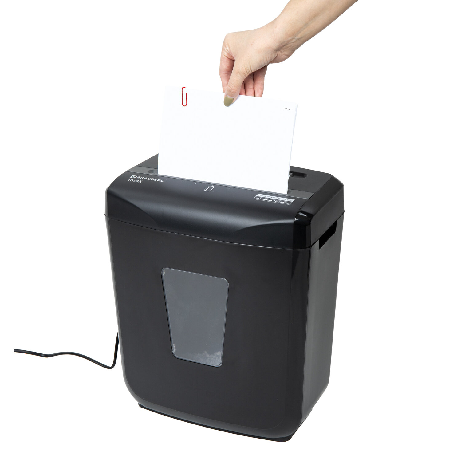 BRAUBERG 1018X снабжен надежными ножами, способными уничтожать не только бумагу, а также пластиковые карты, скрепки и скобы от степлера.