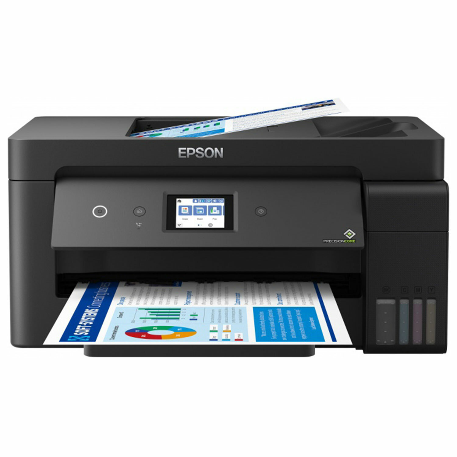 Есть возможность настройки беспроводного соединения по Wi-Fi или подключения к мобильным устройствам без использования ПК благодаря удобному сенсорному ЖК-экрану диагональю 6,1 см. Кроме того, с панели управления можно запускать копирование и сканирование, а также выполнять сервисные команды, такие как проверка и прочистка дюз. МФУ струйное EPSON L14150 "4 в 1" А3, 17 стр./мин, 4800х1200, ДУПЛЕКС, АПД, сетевая карта, Wi-Fi, СНПЧ, C11CH96403