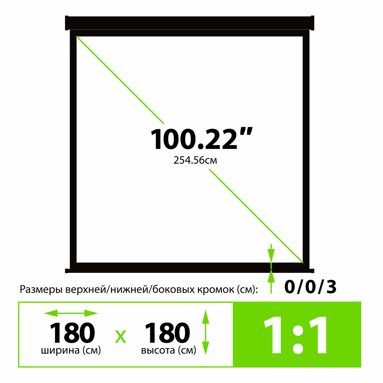 Экран с диагональю 100,22 дюйма и размером 180x180 см оснащён чёрной каймой для улучшения восприятия яркости изображения. Коэффициент отражения составляет 1,0, угол обзора — 160°. Экран Cactus Wallscreen CS-PSW-180X180-BK, 180x180 см, 1:1, настенно-потолочный, черный, PSW-180x180-BK