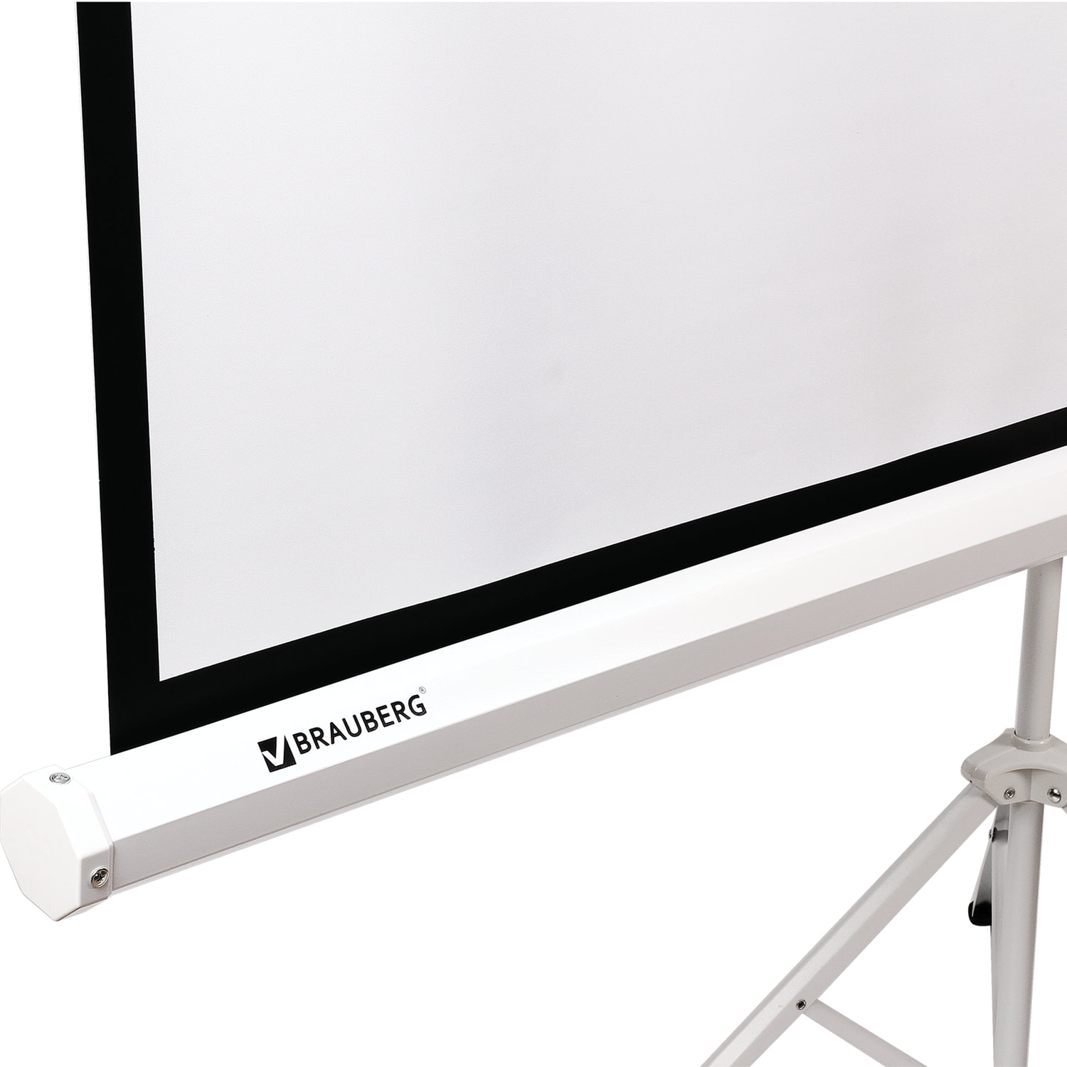 Экран с диагональю 85t; и размером 150х150 см имеет черную кайму для улучшения восприятия яркости изображения. Коэффициент отражения составляет 1, угол обзора – 160°. Устойчивый штатив круглого сечения для надежности конструкции. Телескопическая штанга и кнопка регулировки для настройки высоты. Удобная ручка для переноски. Возможность легкого отсоединения штатива от корпуса экрана. Наконечники ножек предотвращают скольжение экрана и повреждение пола. Также подходит для крепления к потолку. Экран проекционный на треноге (150х150 см), матовый, 1:1, BRAUBERG "TRIPOD", 236729