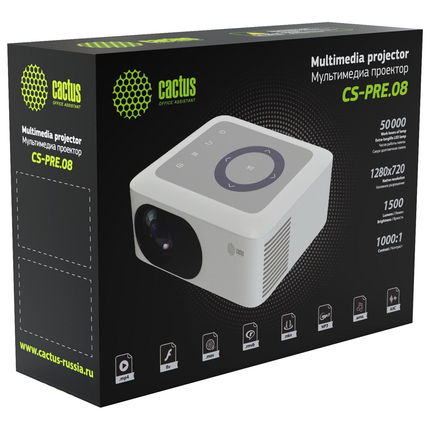- Проектор CACTUS CS-PRE.08WT.WXGA, LCD, 1280x720, 16:9, 1500 лм, 1000:1, 0,5 кг, белый