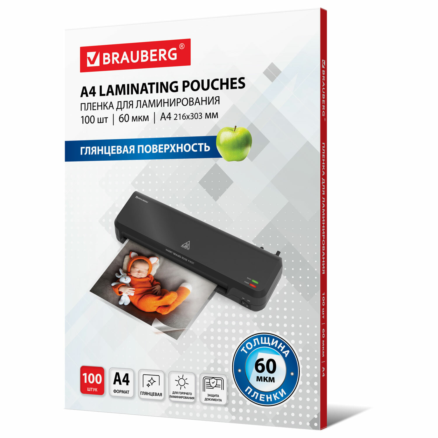 Пленка для ламинирования BRAUBERG формата А4 (216х303 мм) имеет уникальный состав: полиэтилентерефталат (PET), этиленвинилацетат (EVA), полиэтилен (LDPE). Промежуточный слой полиэтилена (LDPE) выступает как связующий элемент между слоями PET и EVA, служит дополнительной защитой от вероятного вытекания клея из-под пленки при ламинировании. Полиэтилен (PE) придает пакетам прочность эластичность и износостойкость. Глянцевое покрытие пленки способствует сохранению и максимальной передаче цвета ламинируемого изображения.