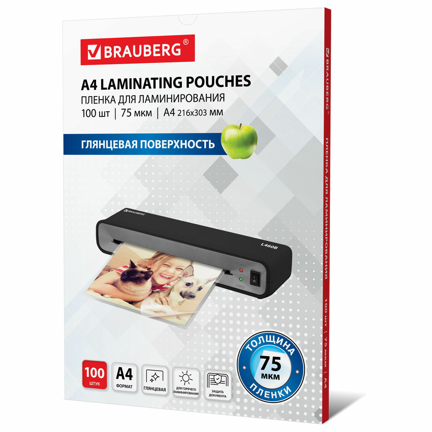 Пленка для ламинирования BRAUBERG формата А4 (216х303 мм) имеет уникальный состав: полиэтилентерефталат (PET), этиленвинилацетат (EVA), полиэтилен (LDPE). Промежуточный слой полиэтилена (LDPE) выступает как связующий элемент между слоями PET и EVA, служит дополнительной защитой от вероятного вытекания клея из-под пленки при ламинировании. Полиэтилен (PE) придает пакетам прочность эластичность и износостойкость. Глянцевое покрытие пленки способствует сохранению и максимальной передаче цвета ламинируемого изображения.