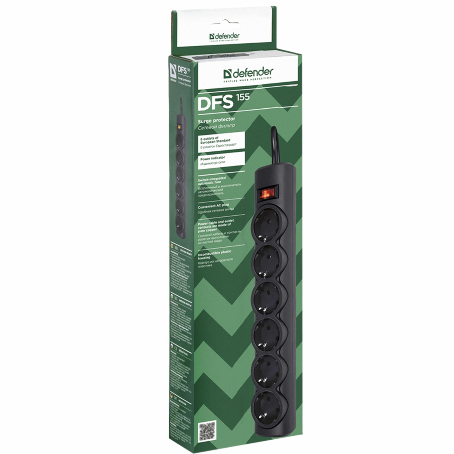 - Сетевой фильтр DEFENDER DFS 155, 6 розеток, 5 м, черный, 99496