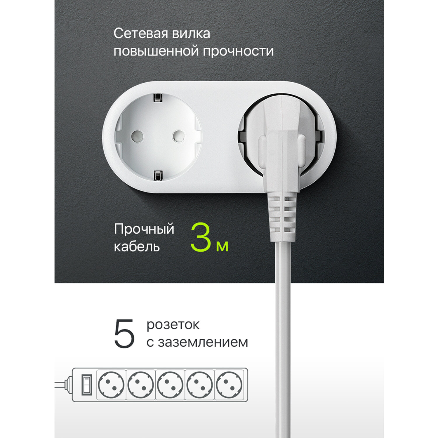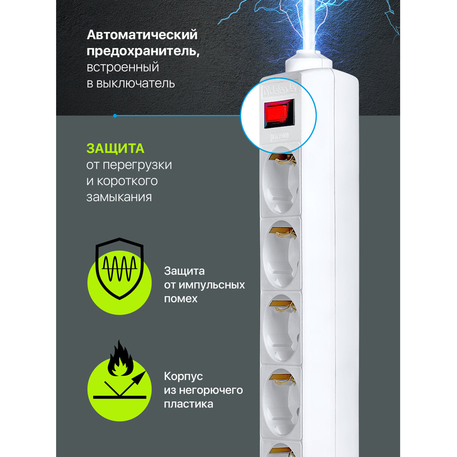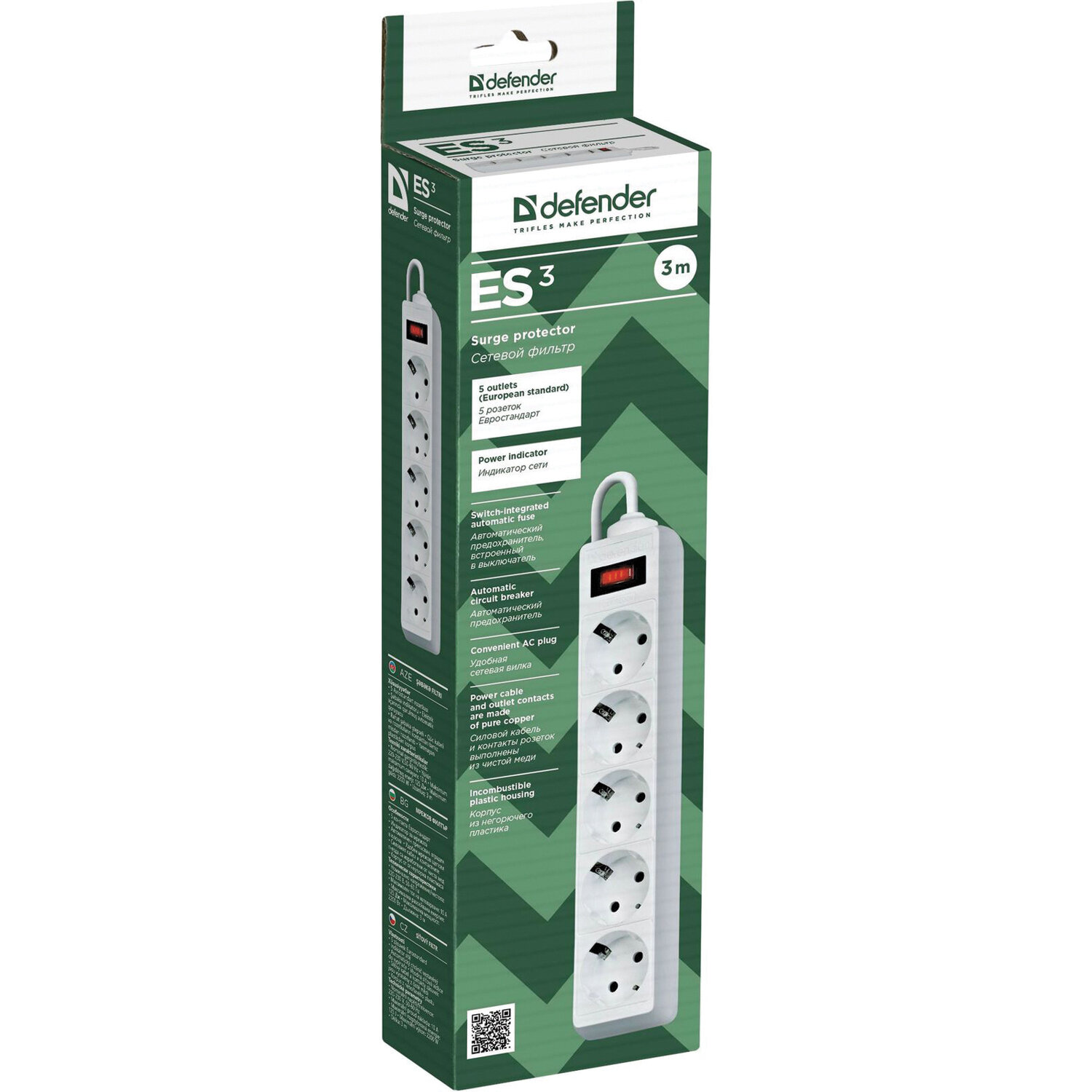 - Сетевой фильтр DEFENDER ES, 5 розеток, 3 м, белый, 99482