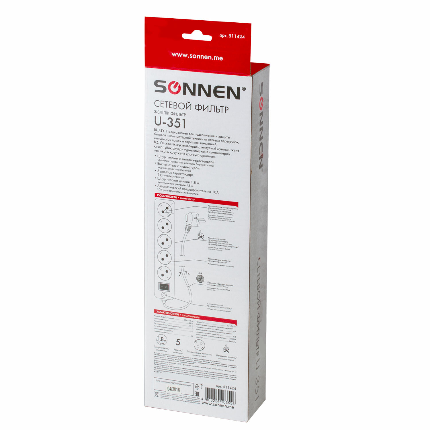 Cетевой фильтр SONNEN U-351. Количество розеток – 5. Каждая розетка оснащена заземляющими контактами и защитными шторками. Корпус выполнен из негорючего ABS пластика. На корпусе расположен выключатель и автоматический предохранитель. Толщина жил кабеля – 3х0,75 мм, длина кабеля – 1,8 м. Материал жил кабеля – медь. Номинальная частота – 50 Гц, номинальное напряжение – 220 Вт, максимальный ток нагрузки – 10 А, суммарная мощность нагрузки – 2200 Вт.