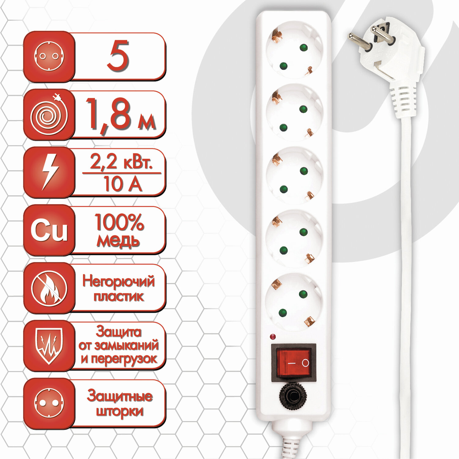 - Сетевой фильтр SONNEN U-351, 5 розеток, с заземлением, выключатель, 10 А, 1,8 м, белый, 511424