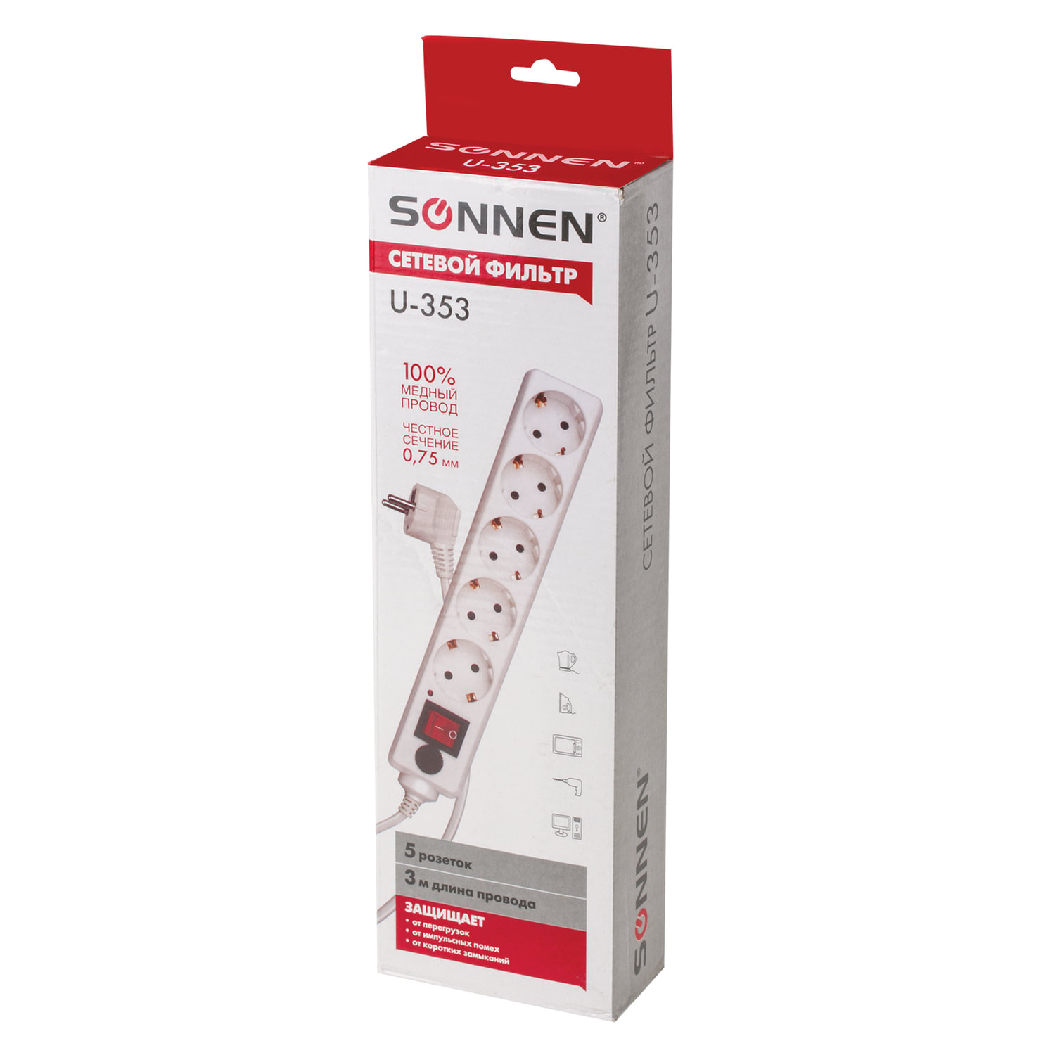 - Сетевой фильтр SONNEN U-353, 5 розеток, с заземлением, выключатель, 10 А, 3 м, белый, 511425
