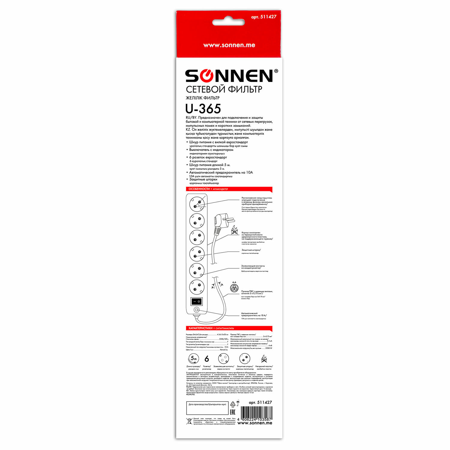 Сетевой фильтр SONNEN U-365, 6 розеток, с заземлением, выключатель, 10 А, 5 м, белый, 511427