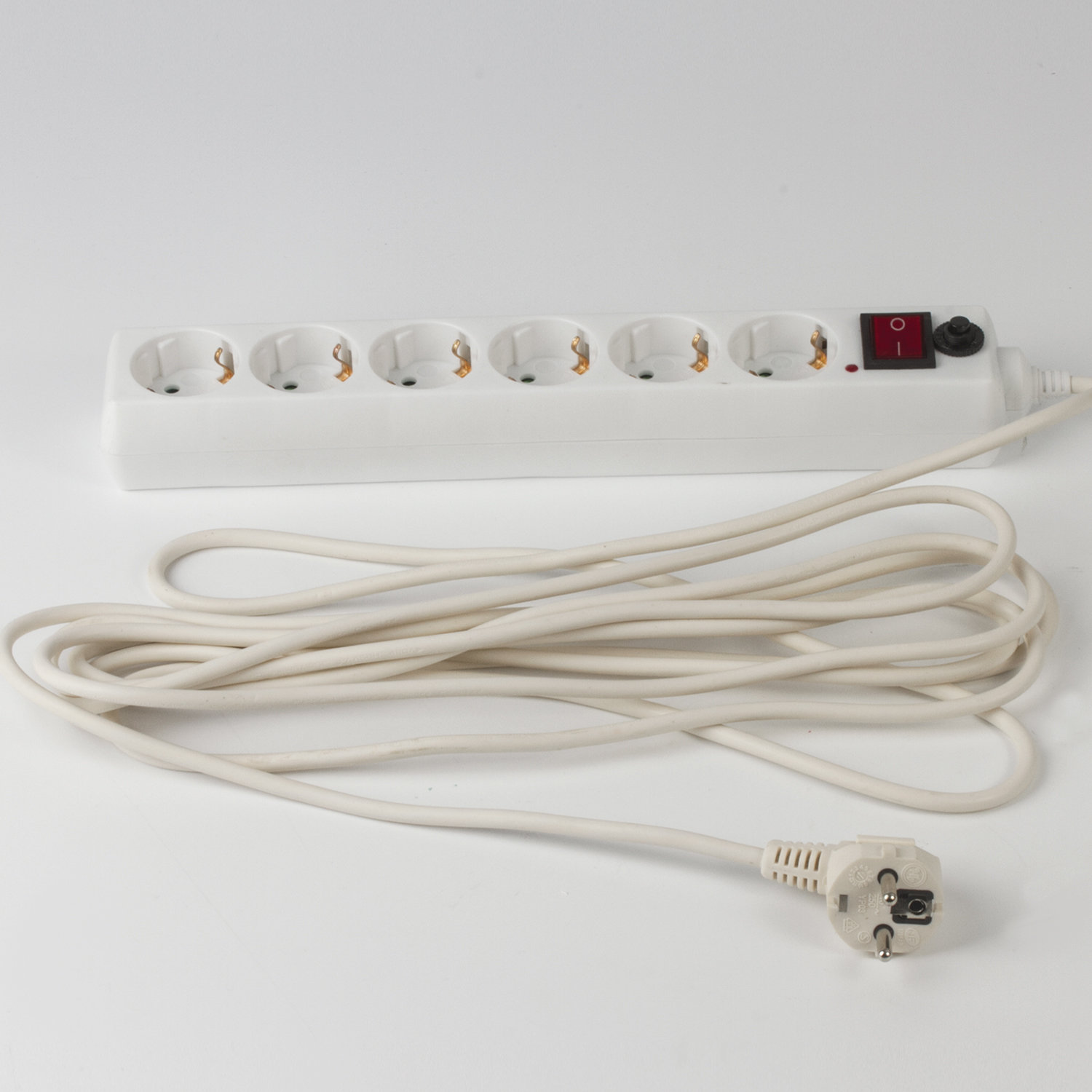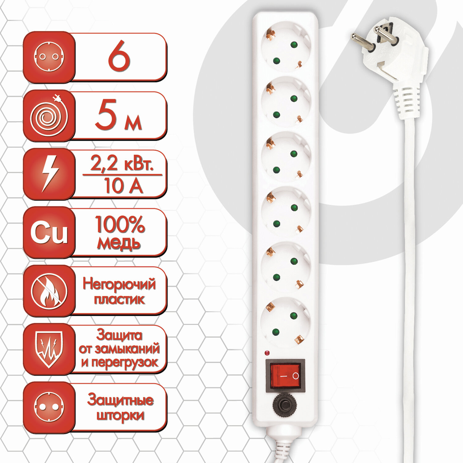 Имеет возможность крепления на стену. Количество розеток - 6. Каждая розетка оснащена заземляющими контактами и защитными шторками. Корпус выполнен из негорючего ABS-пластика. На корпусе расположен выключатель и автоматический предохранитель. Толщина жил кабеля – 3х0,75 мм, длина кабеля – 5 м. Материал жил кабеля - медь. Номинальная частота – 50 Гц, номинальное напряжение – 220 Вт, максимальный ток нагрузки - 10 А, суммарная мощность нагрузки: 2200 Вт.