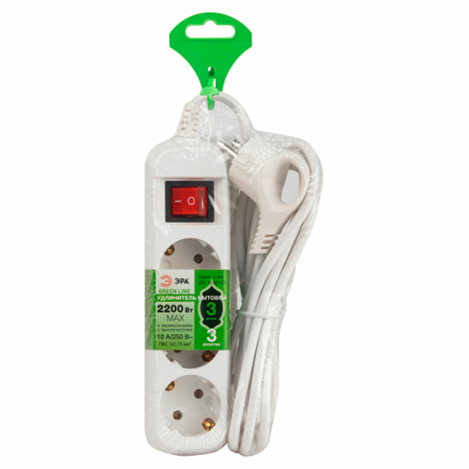 - Удлинитель ЭРА UDL-10 Greenline, 3 розетки, с заземлением, с выключателем, 10 А, 3 м, белый, UDL-10-330-ES
