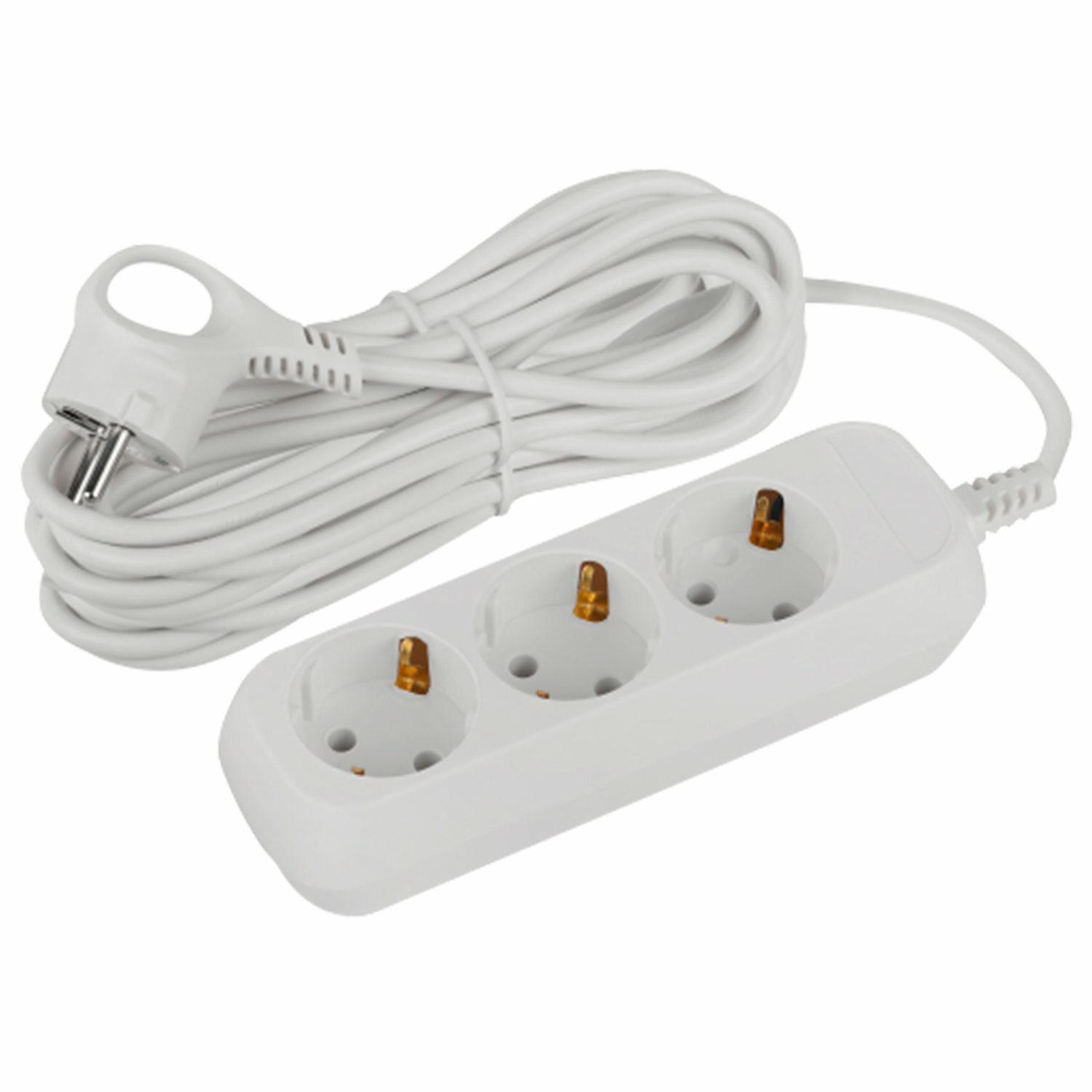 Сетевой удлинитель в пластиковом корпусе оснащен 3 розетками с заземлением. Корпус выполнен из негорючего пластика. Толщина жил кабеля – 3x1 мм, длина кабеля – 7 м, номинальное напряжение – 220 Вт, максимальный ток нагрузки – 16 А, суммарная мощность нагрузки – 3500 Вт.