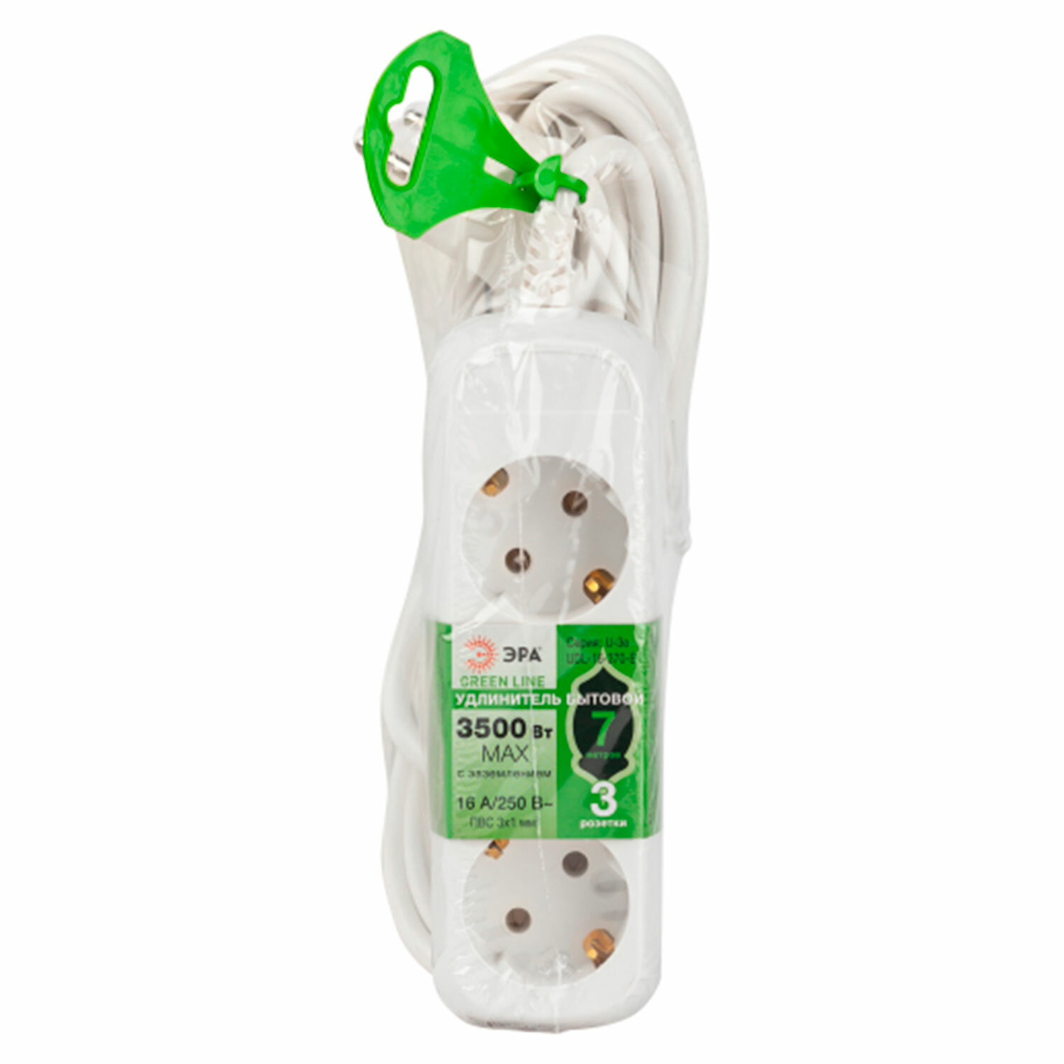 - Удлинитель ЭРА UDL-16 Greenline, 3 розетки, с заземлением, 16 А, 7 м, белый, UDL-16-370-E