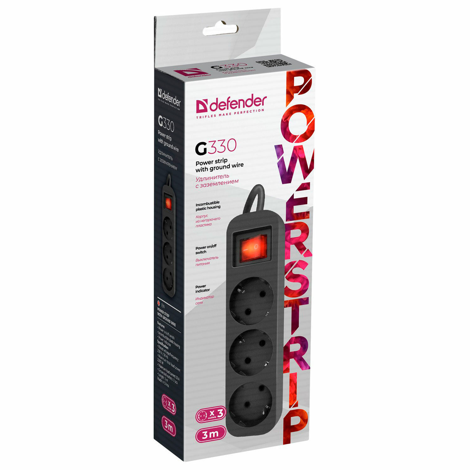 Вся информация на сайте о товарах носит справочный характер и не является публичной офертой в соответствии с пунктом 2 статьи 437 ГК РФ. Производитель оставляет за собой право изменять характеристики товара, его внешний вид и комплектность без предварительного уведомления продавца. Удлинитель сетевой DEFENDER G330, 3 розетки, c заземлением, выключатель, 10А, длина 3 м, черный, 99334