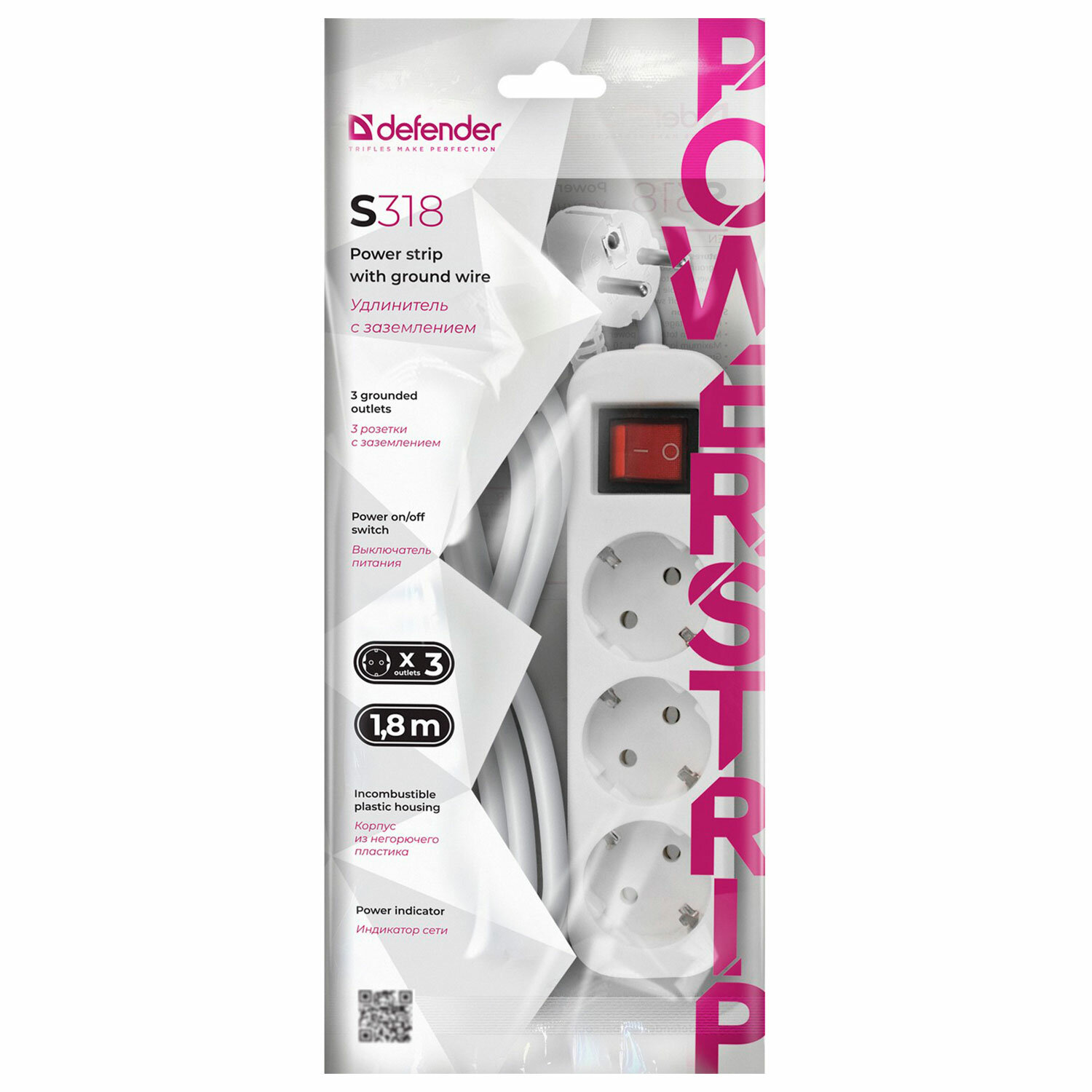 Удлинитель сетевой DEFENDER S318, 3 розетки c заземлением, выключатель, 10А, длина 1,8 м, белый, 99233