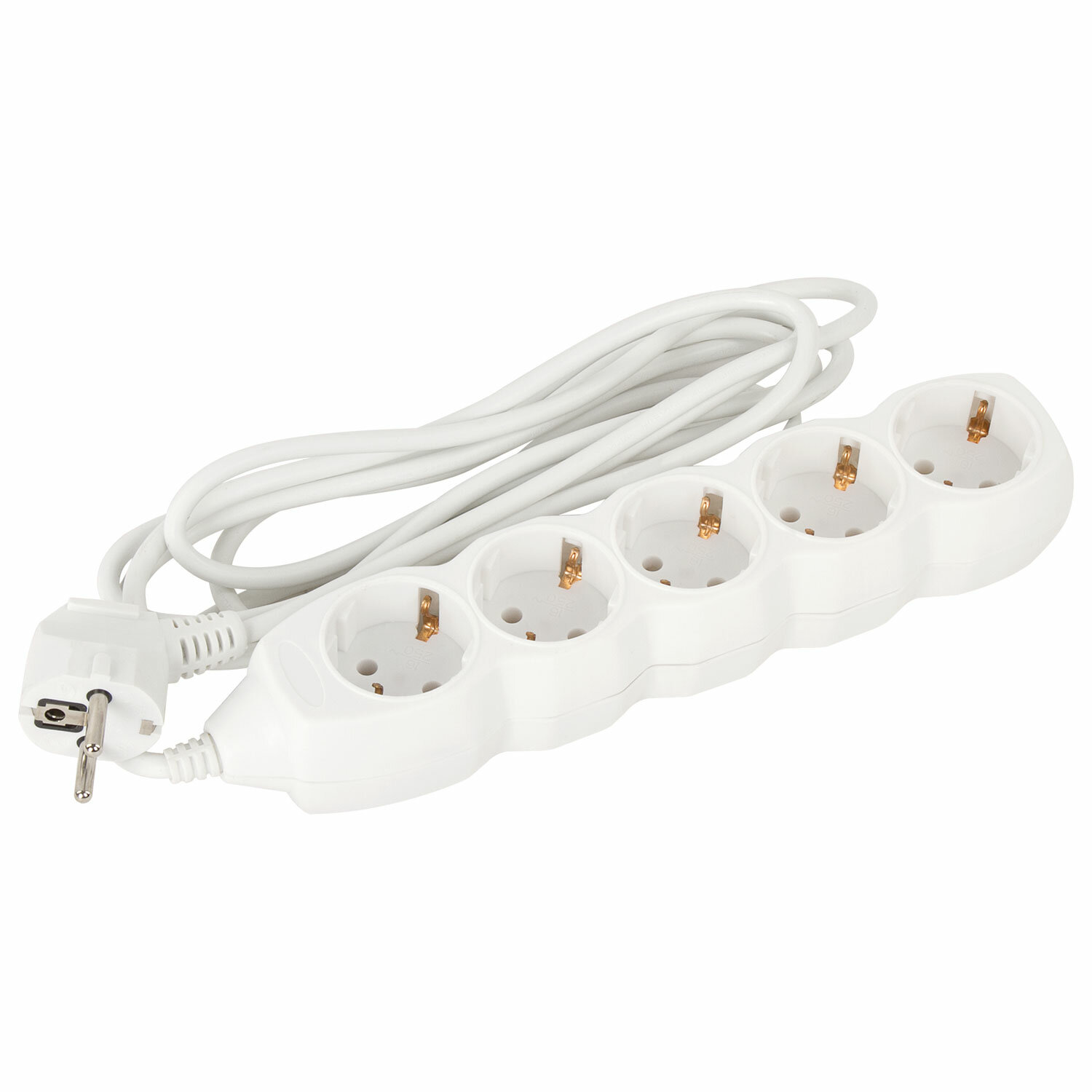 Сетевой удлинитель в пластиковом корпусе оснащен 5 евророзетками с заземлением. Максимальный ток нагрузки подключенных устройств может достигать 10 А. В сочетании эти параметры позволяют безопасно подключать к удлинителю до 3 электроприборов. Длина кабеля – 3 метра, что позволит использовать удлинитель как внутри помещения, так и снаружи.