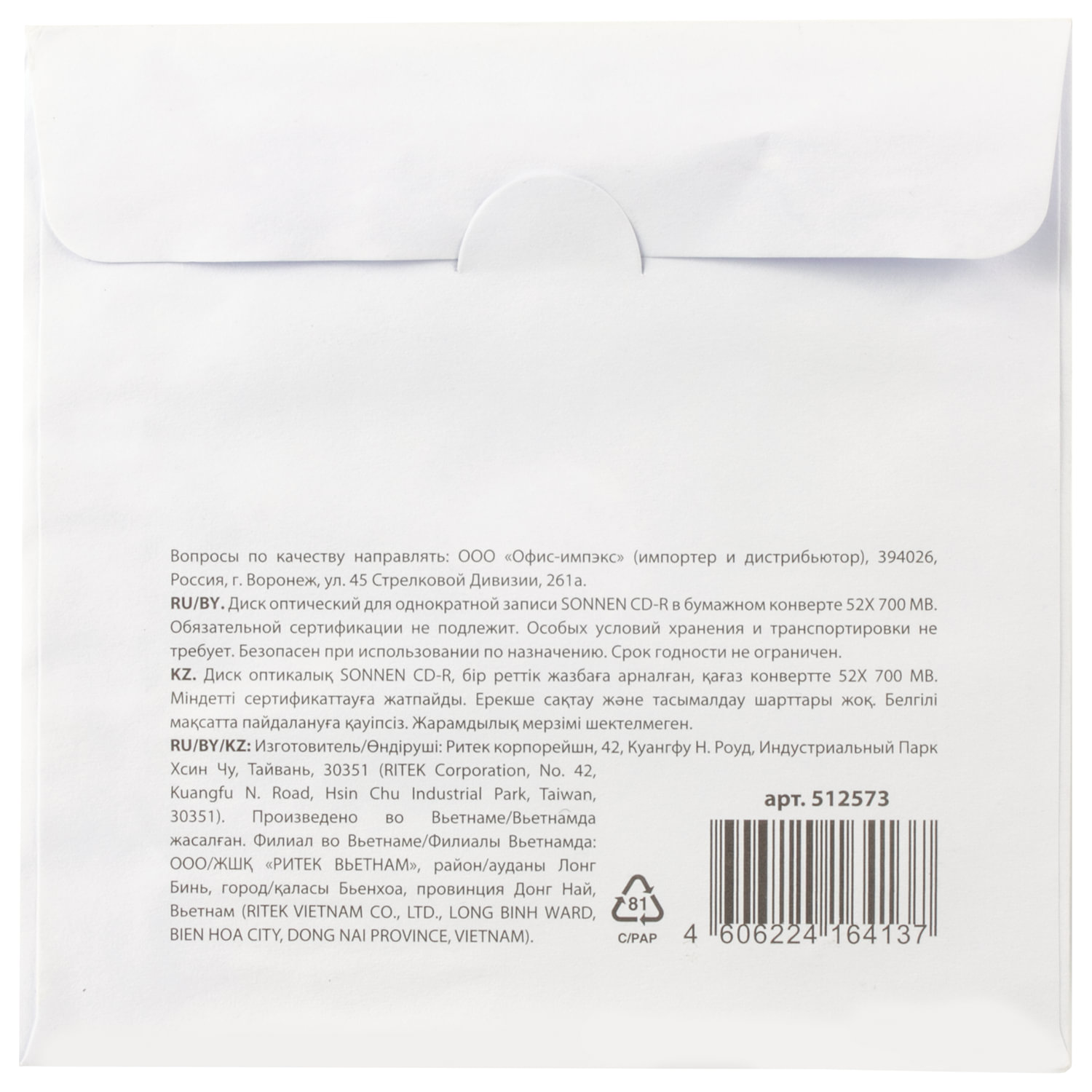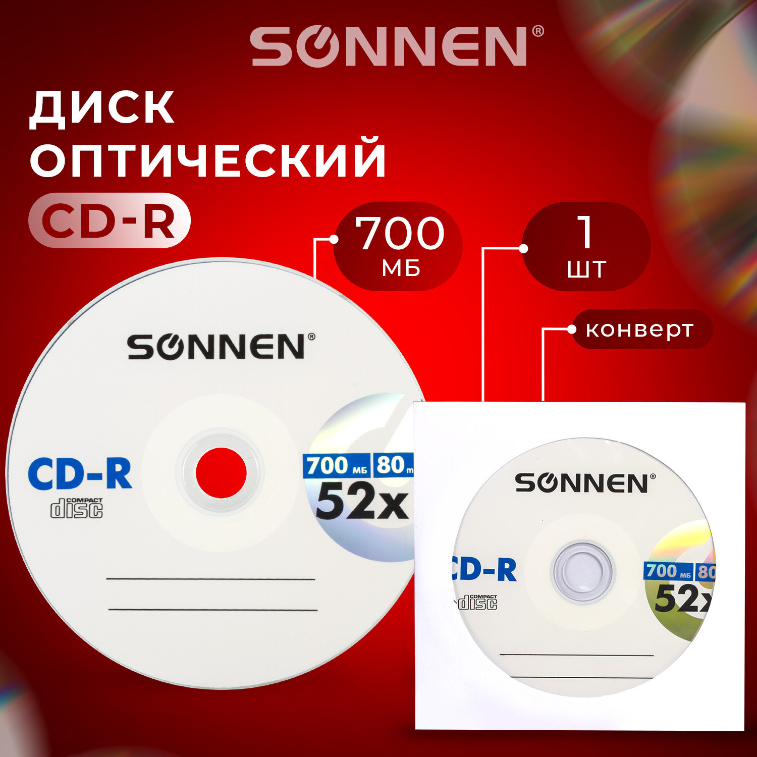 - Диск CD-R SONNEN, 700 Mb, 52x, бумажный конверт (1 штука), 512573