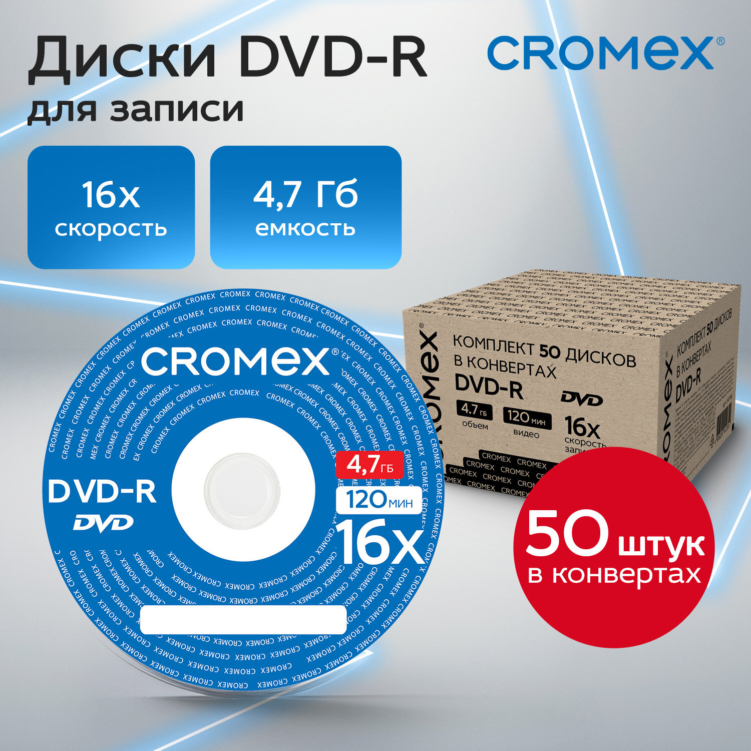 - Диски DVD-R в конверте КОМПЛЕКТ 50 шт., 4,7 Gb, 16x, CROMEX, 513798