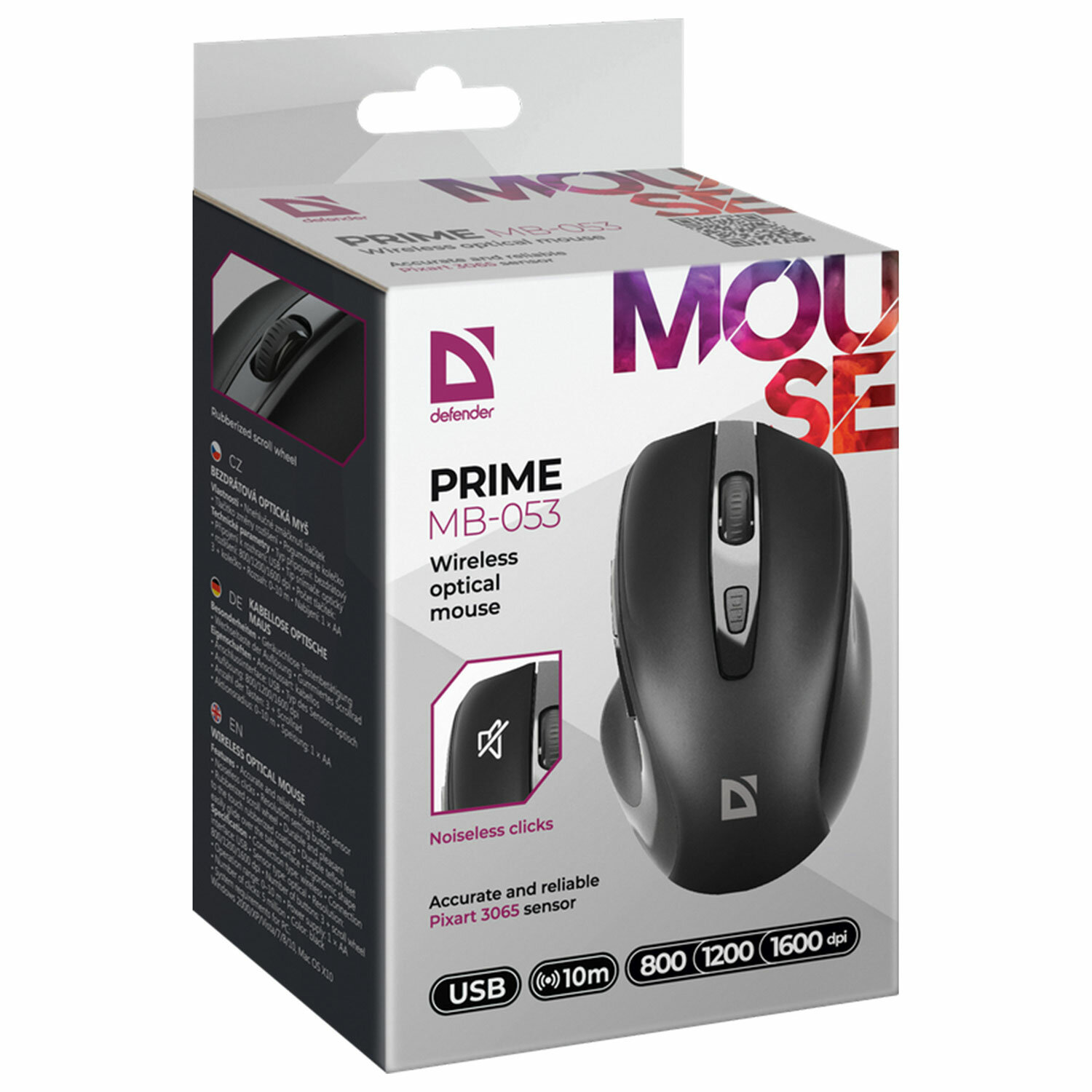- Мышь беспроводная DEFENDER Prime MB-053, USB, 5 кнопок + 1 колесо-кнопка, оптическая, черная, 52053