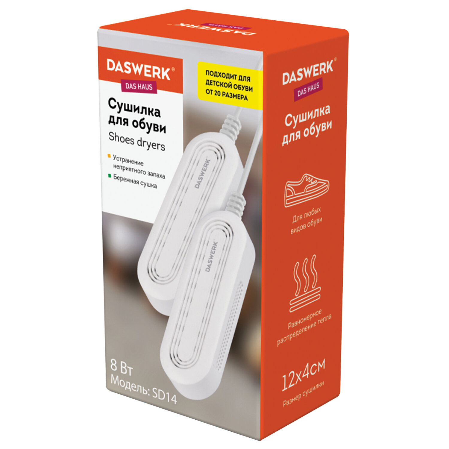 Благодаря компактному размеру 12х4 см сушилка DASWERK идеально подходит для детской обуви от 20 размера.